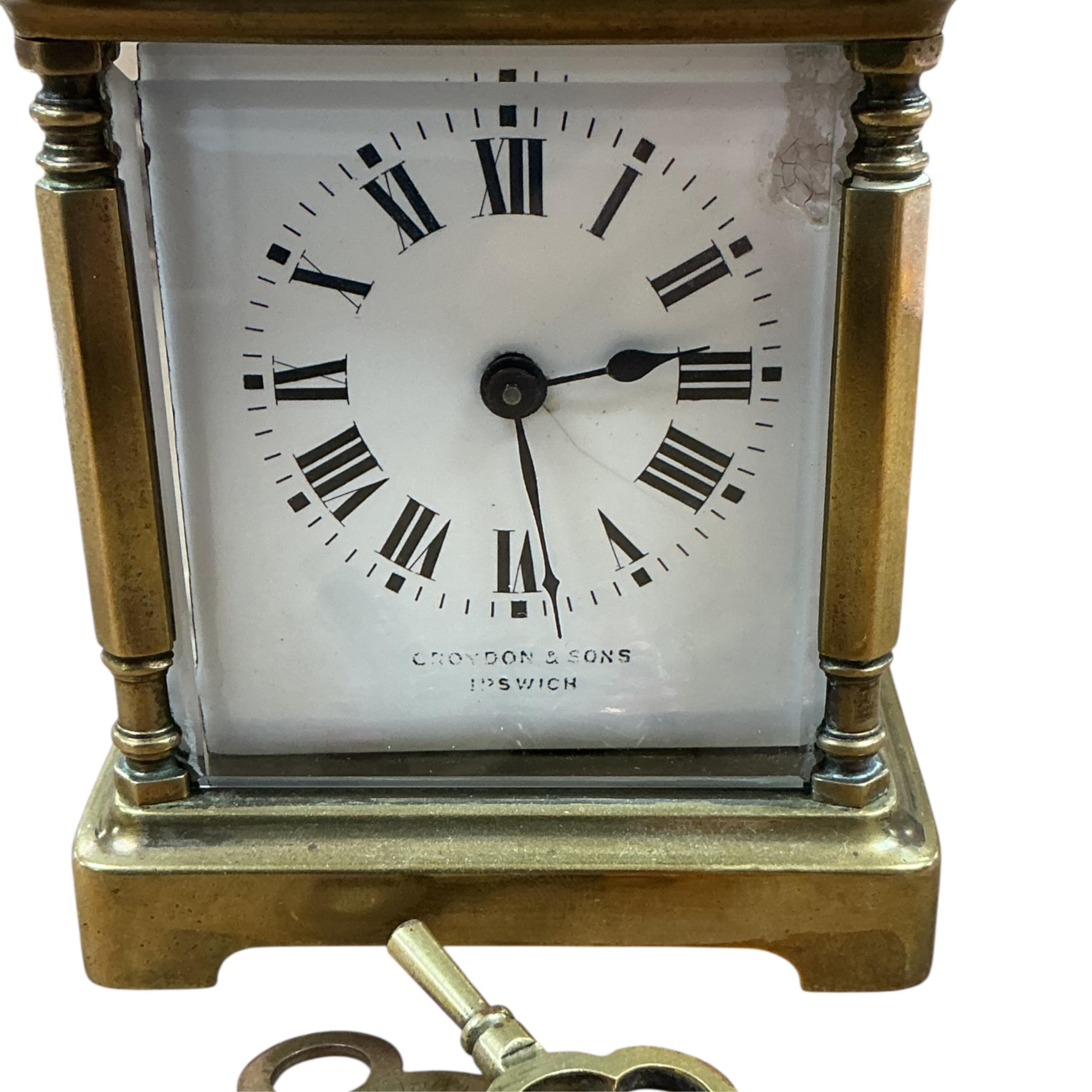 A small early 20th century lacquered brass carriage timepiece, the dial inscribed Croydon & Sons, Ipswich, two two keys, 13cm high