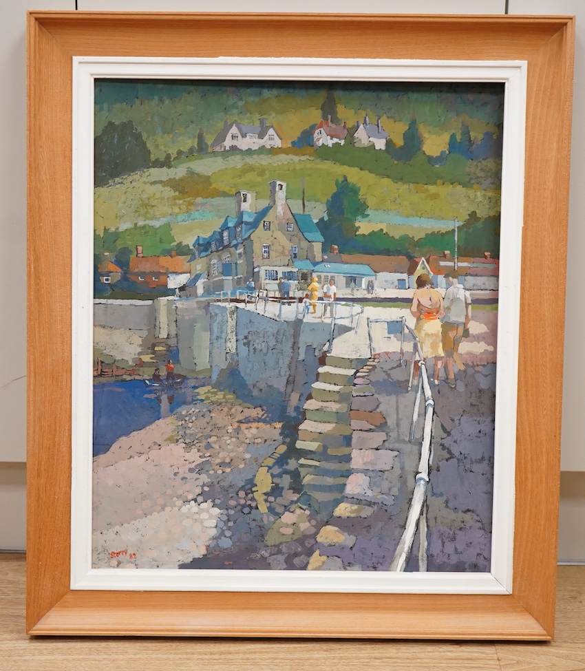 Warren Storey RWA (1924-2008), harbour view with figures, signed and dated ‘82, oil on board, 58 x 47cm