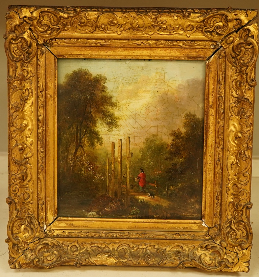 Manner of John Constable RA (1776-1837), Pastoral landscape with a figure and dog crossing a bridge, with accompanying paperwork from The City Museum Bristol, oil on panel, gilt framed, 19 x 17cm