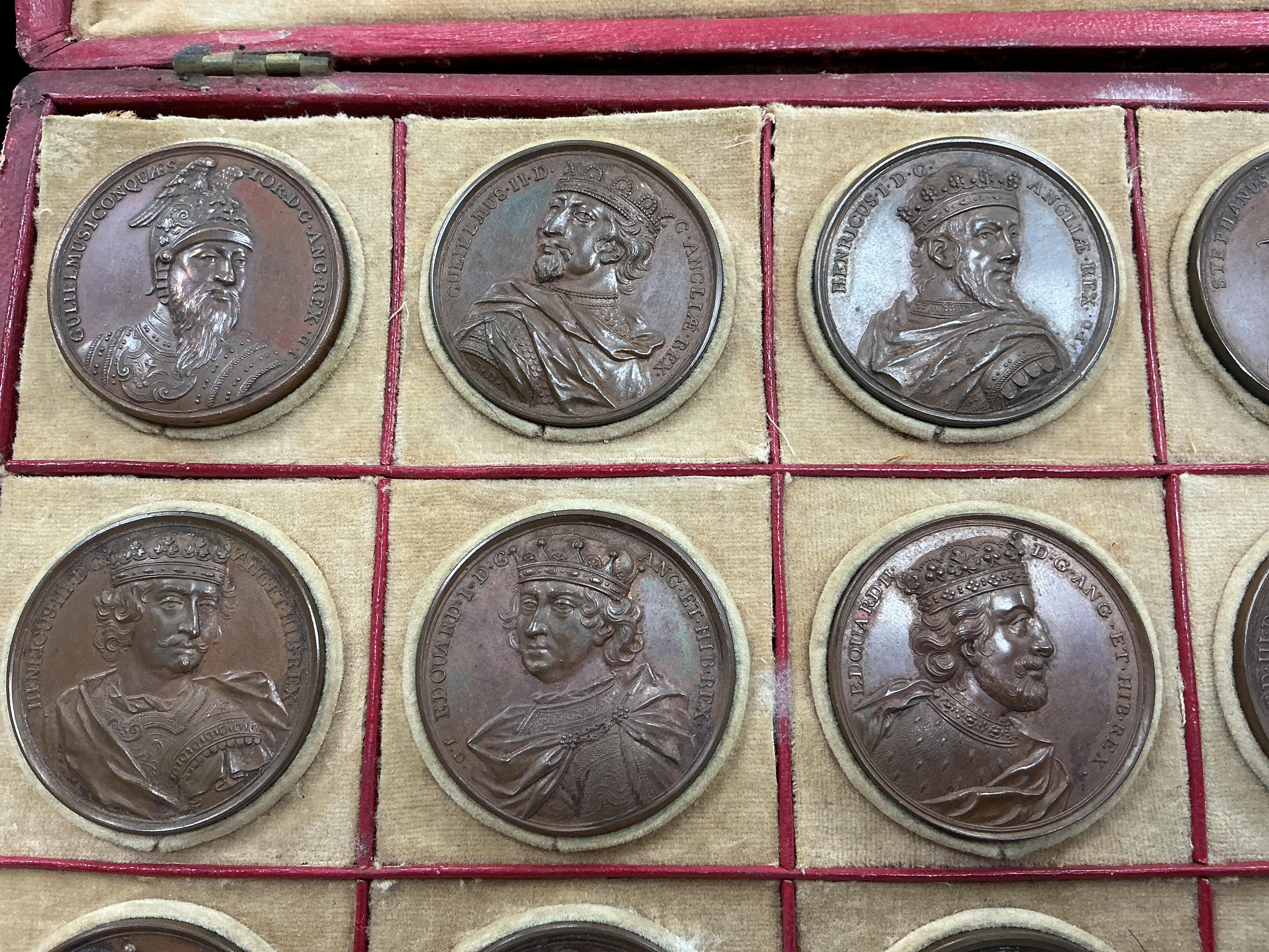 British commemorative medals, The Kings and Queens of England, Jean Dassier‘s complete set of 35 Medals, in copper, 1731-1732, from William the Conqueror to the dedication medal of George II and Queen Caroline, 40mm and the slightly reduced size Cromwell, 38mm, Eisner I, p. 252-266, the medals EF, complete sets scarce, contained in a 19th century red Morocco leather covered case