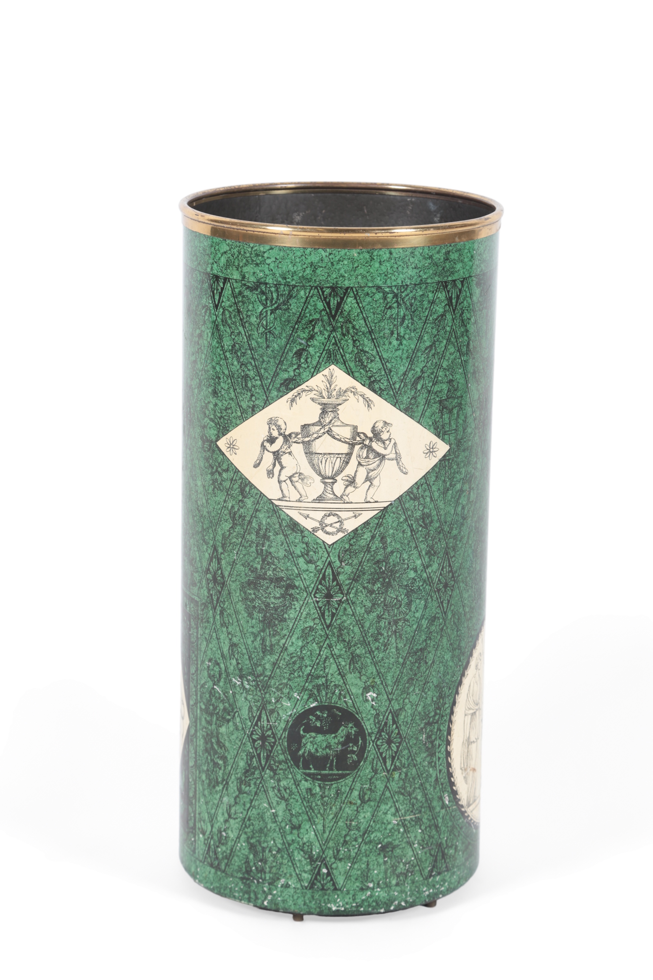 Piero Fornasetti (Italian, 1913-1988): An umbrella/stick stand, the cylindrical body decorated with Trompe-l'œil decoration on a malachite green ground, brass rim, mark to the underside, with internal drip tray, 26cm diameter x 56cm high