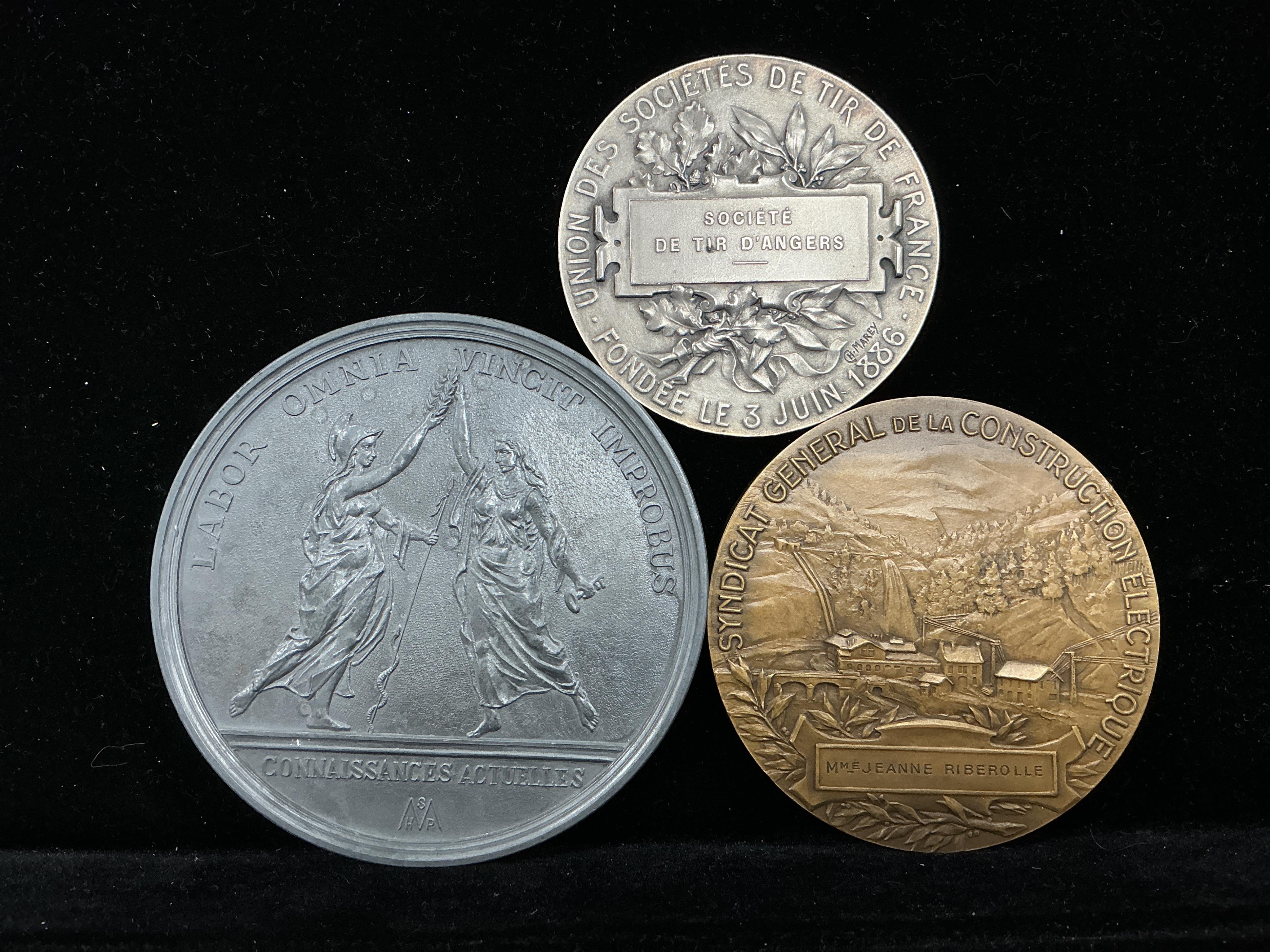 Lot 2044 , France, three commemorative medals, Syndicat General de la Construction Electrique, c.1920, a bronze medal by Ch. Pillet, semi-naked figure representing Electricity seated on globe, rev. dam and buildings, named (Mme Jea