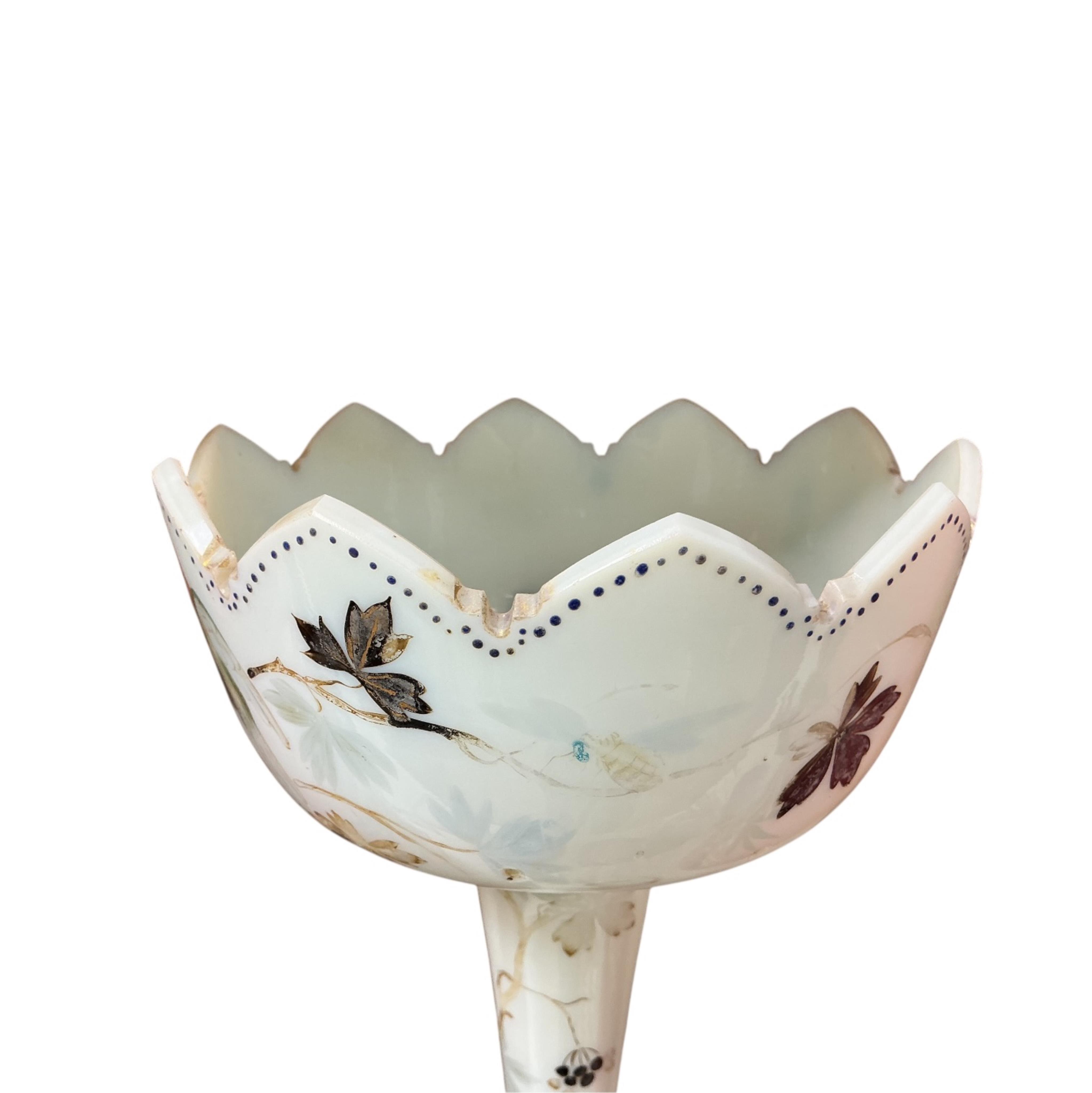 Lot 1487 , A pair of Victorian opaque pink and enamelled glass vases, and a Victorian enamelled glass table lustre, latter 32cm