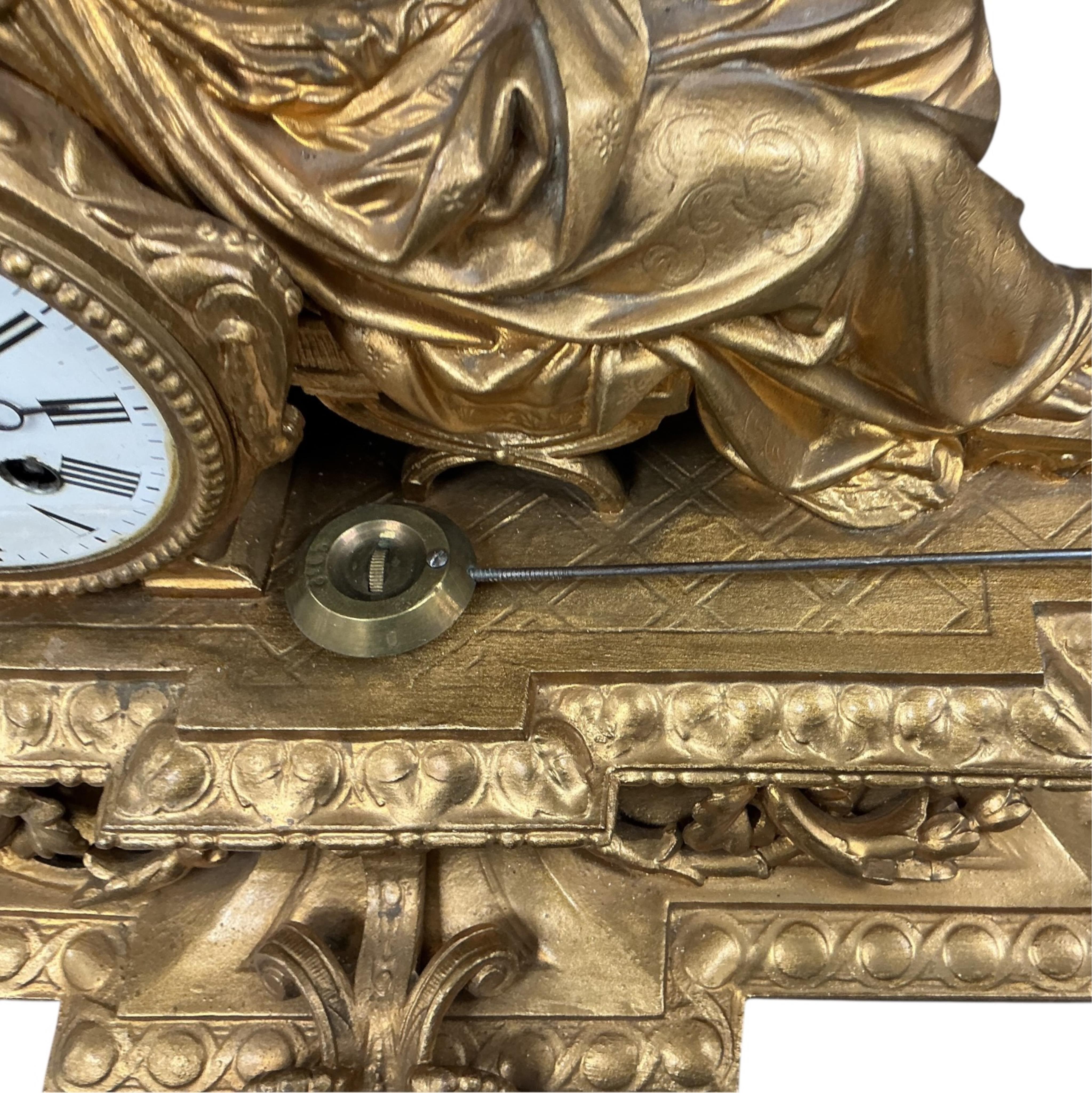 Lot 1498 , A late 19th century gilt spelter mantel clock surmounted with a lady reading a book, raised on ebonised base, with pendulum, 40cm high