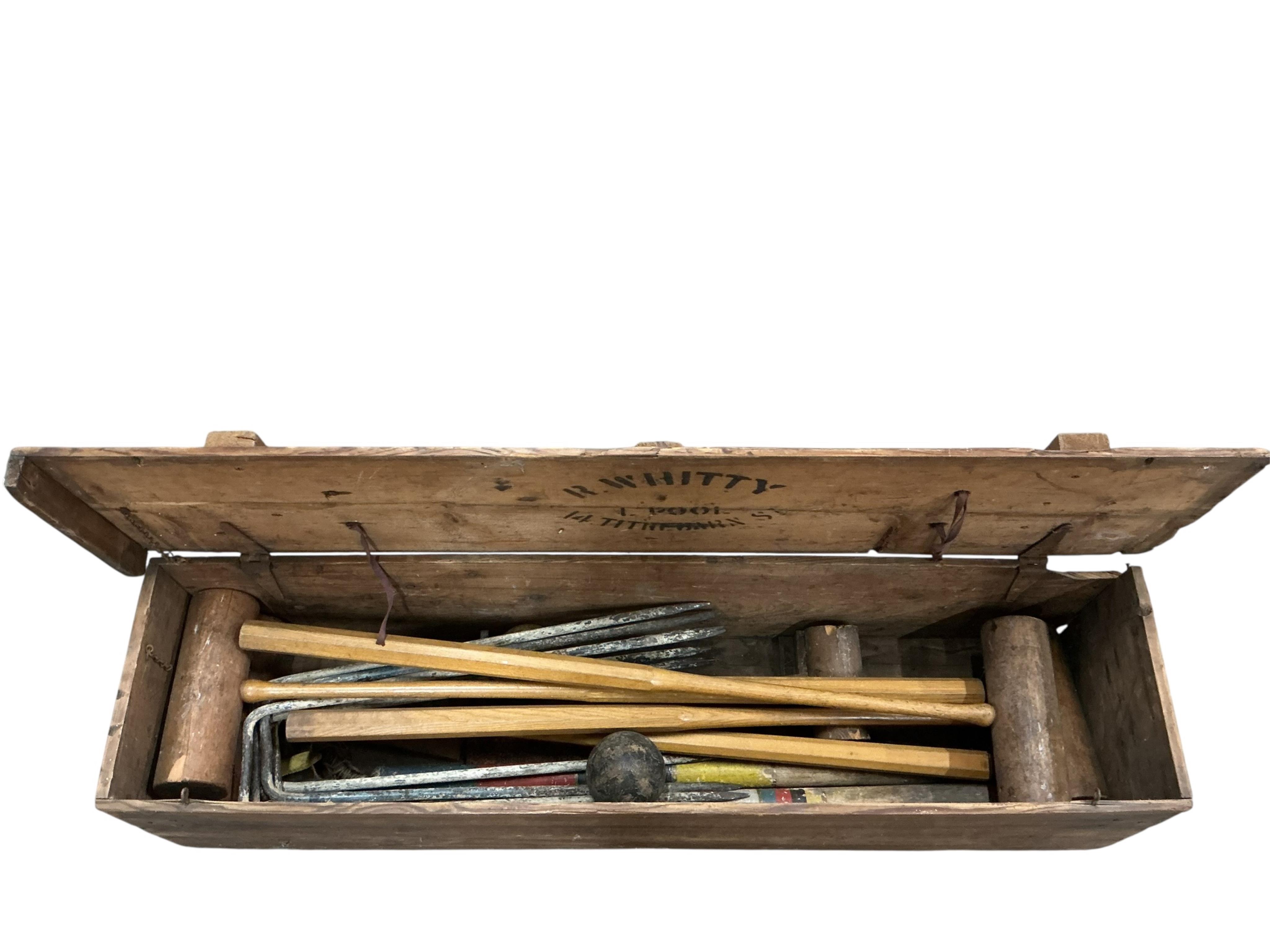 An R. Whitty boxed croquet set, width 114cm, depth 28cm, height 28cm