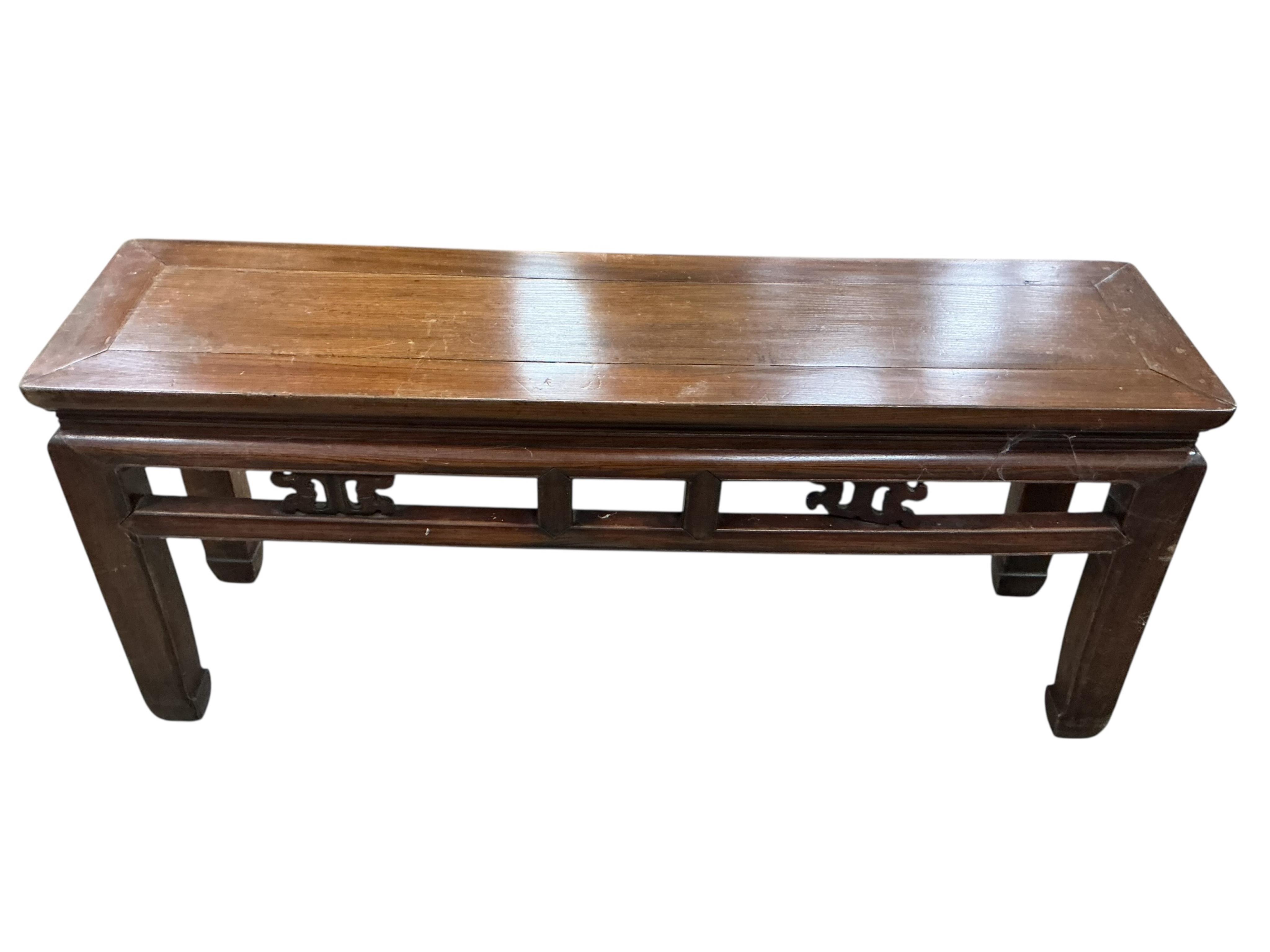 Lot 210 , Two Chinese low elm and lacquer benches, larger width 111cm, depth 33cm, height 49cm, width 111cm, depth 29cm, height 48cm