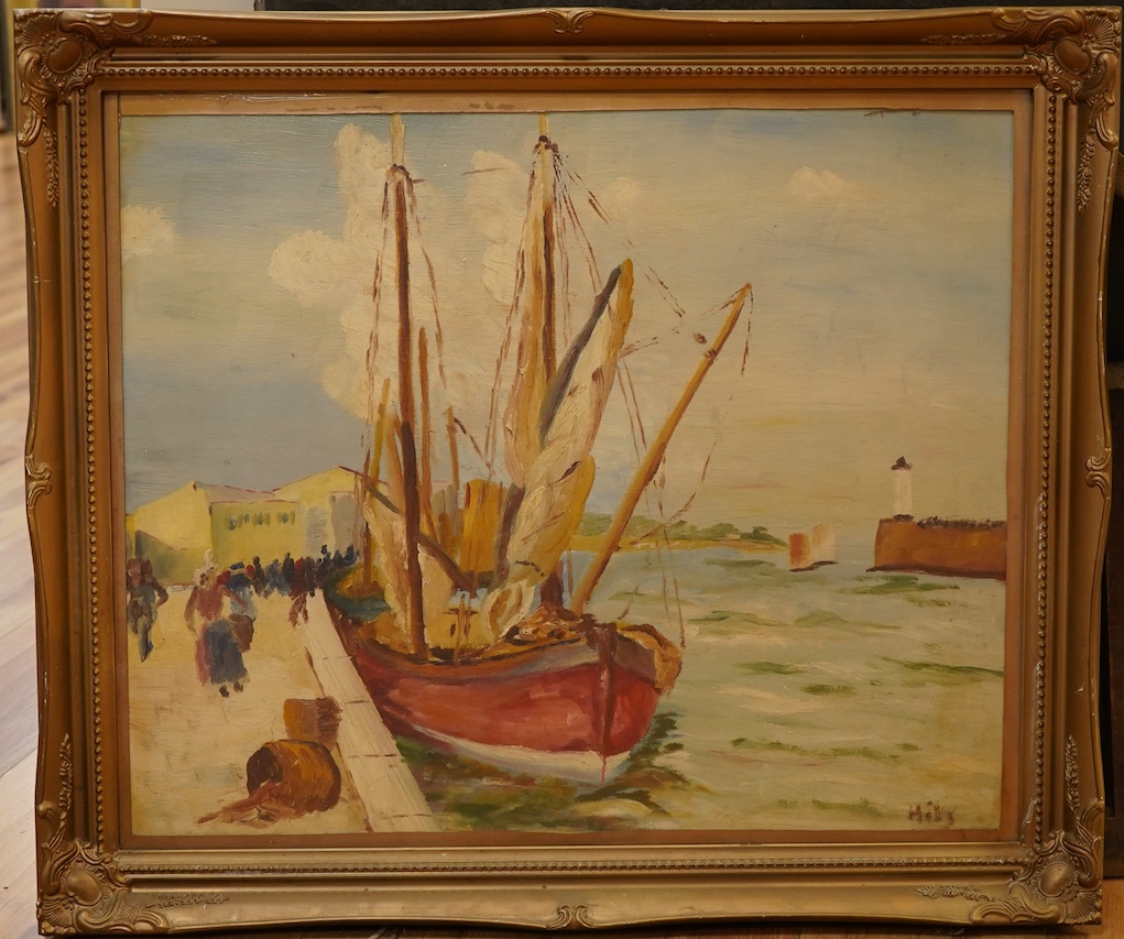 20th century, harbour view with moored boats, indistinctly signed, Impressionist oil on board, 47 x 57cm