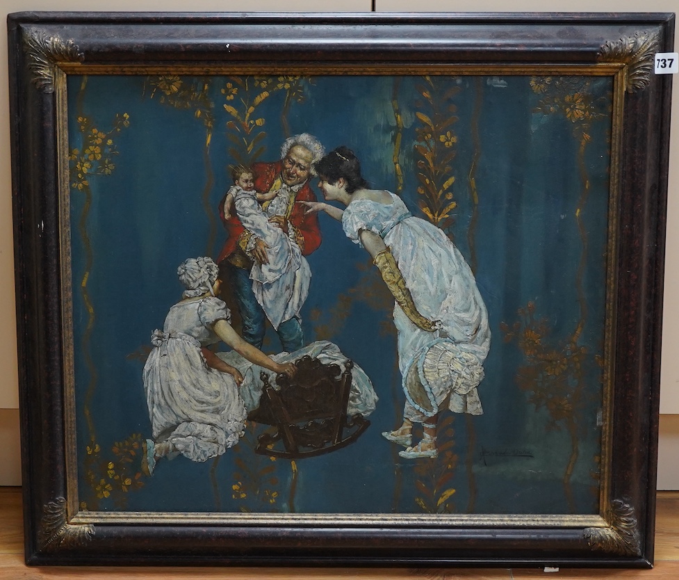Antonio Corrado Orilia (Italian, 1861-1904), figures wearing Regency dress, signed, oil on metal panel, 49 x 59cm