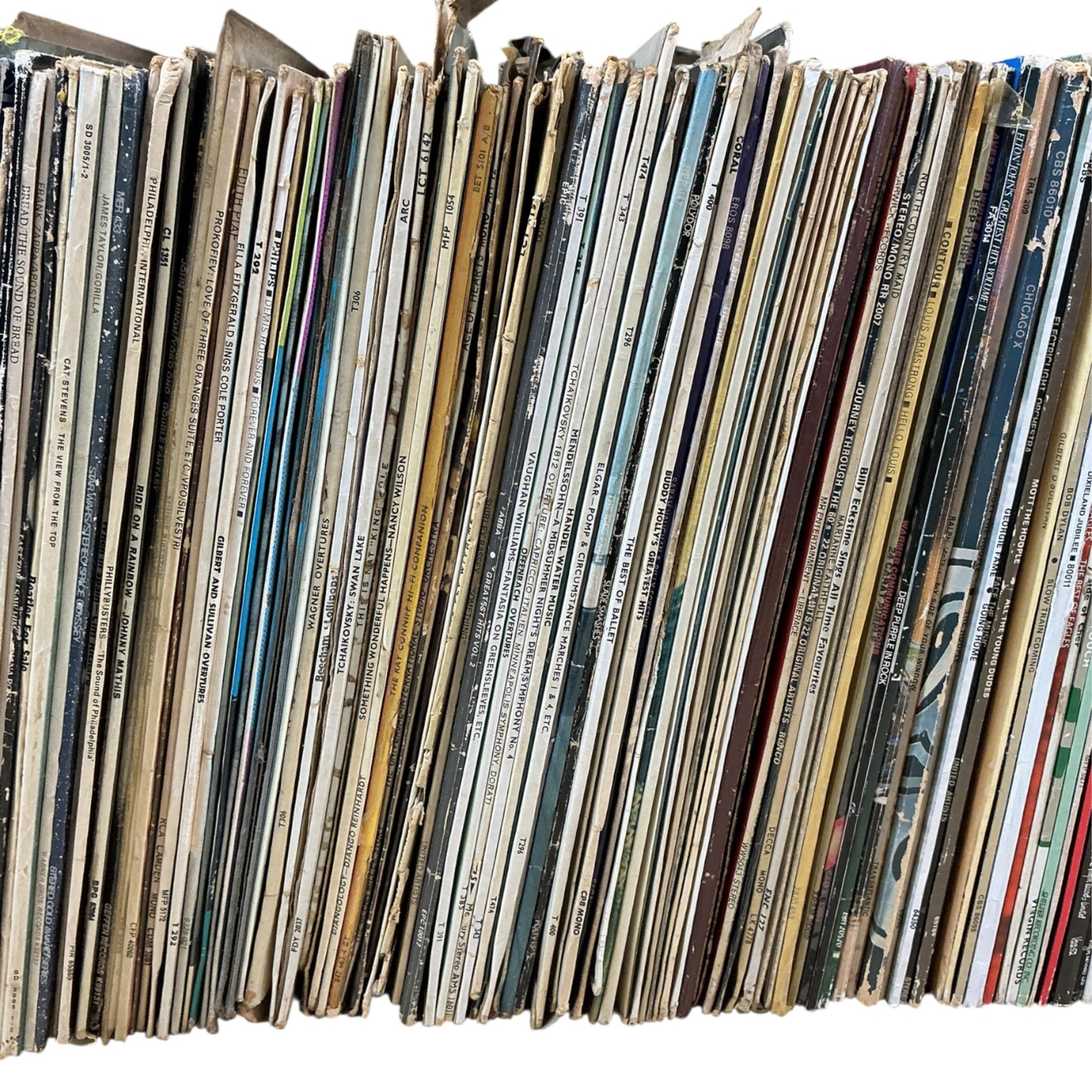 A collection of LP record albums, artists including; The Beatles, the Hollies, Joan Baez, Jimi Hendrix, Frank Zappa, Bob Dylan, David Bowie, Ella Fitzgerald, Phil Collins, Chris Rea, the Eagles, Mott the Hoople, Elton John, etc., plus a number of classical albums, jazz albums and various compilations
