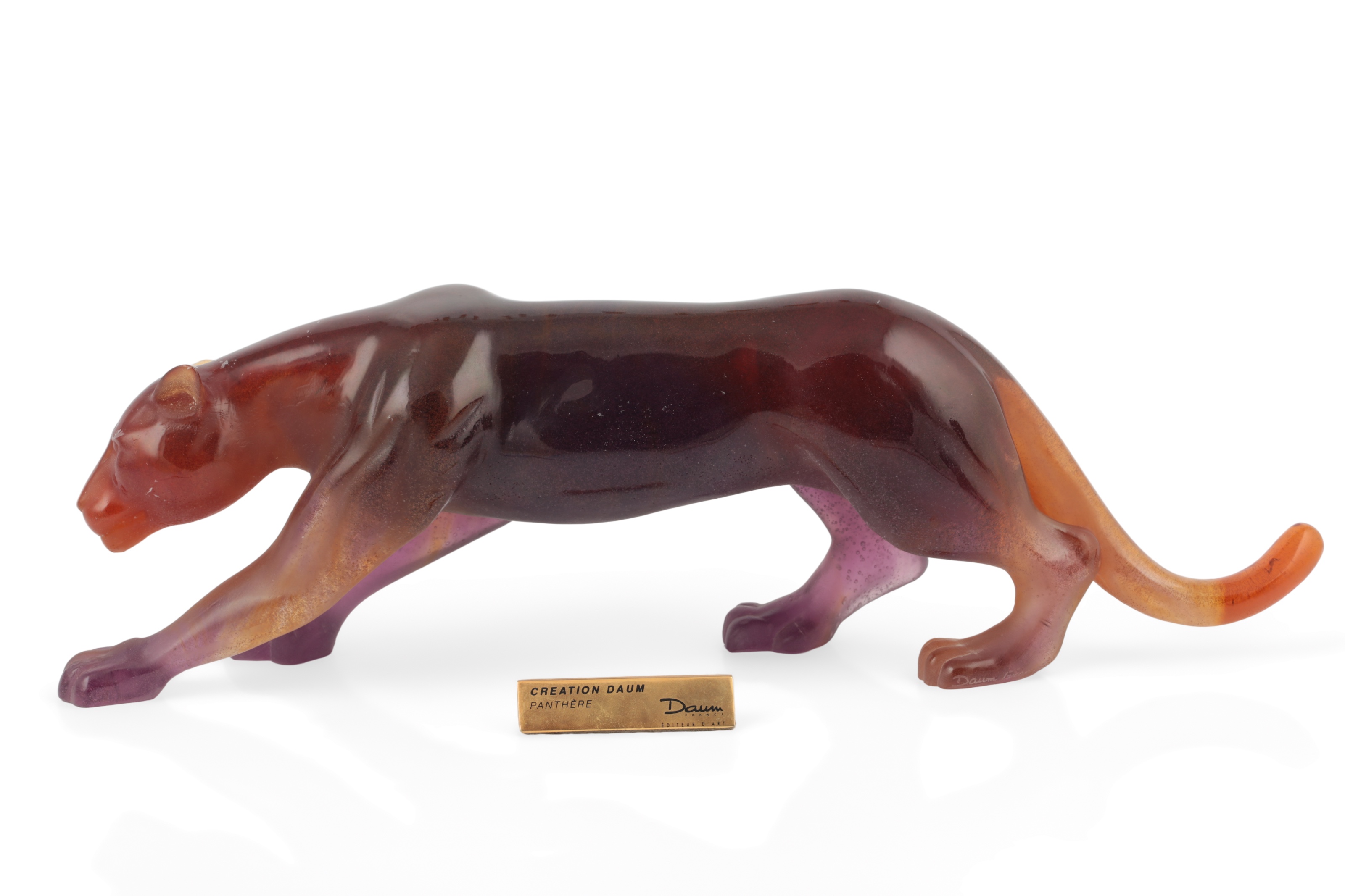 Daum, Nancy: 'Panthere' A pâte-de-verre coloured glass model of a panther, in amber and amethyst hues, etched signature to the hindmost paw, numbered 009/200 to another paw, 42cm long; with associated "Creation Daum' display marker (2)