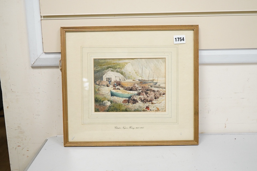Lot 1754 , Attributed to Charles Napier Hemy RA (1841-1917), moored fishing boats along a coastline, monogrammed CH, watercolour, 14 x 19cm