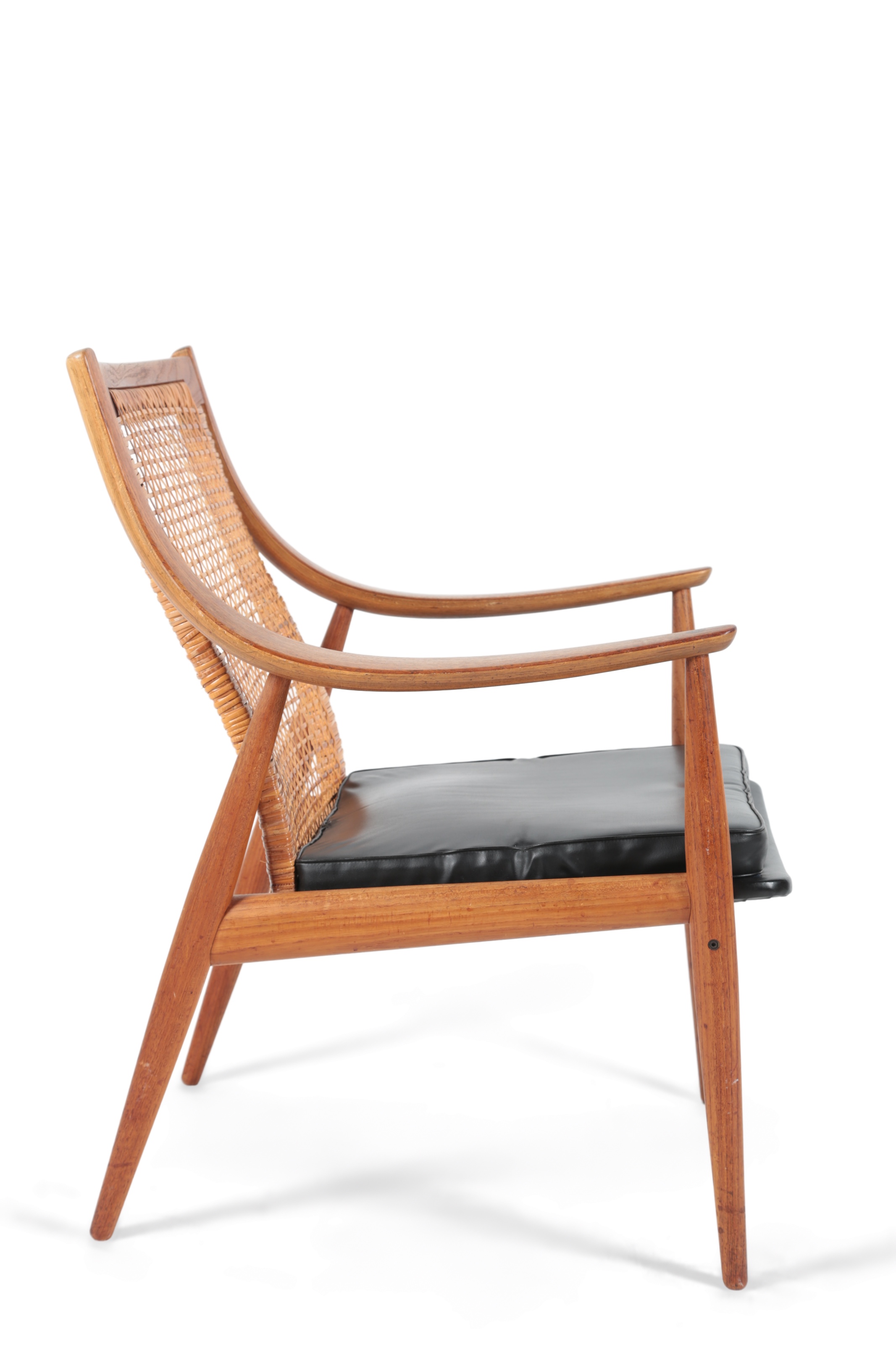 Peter Hvidt (Danish, 1916–1986) and Orla Mølgaard-Nielsen (Danish, 1907–1993) for France and Son: A 'Model FD 146' teak and cane easy chair, with a caned back support and curved arms, with removable cushion above a sprung seat, manufacturer's mark and button to the underside, 83cm high x 63cm wide x 68cm deep