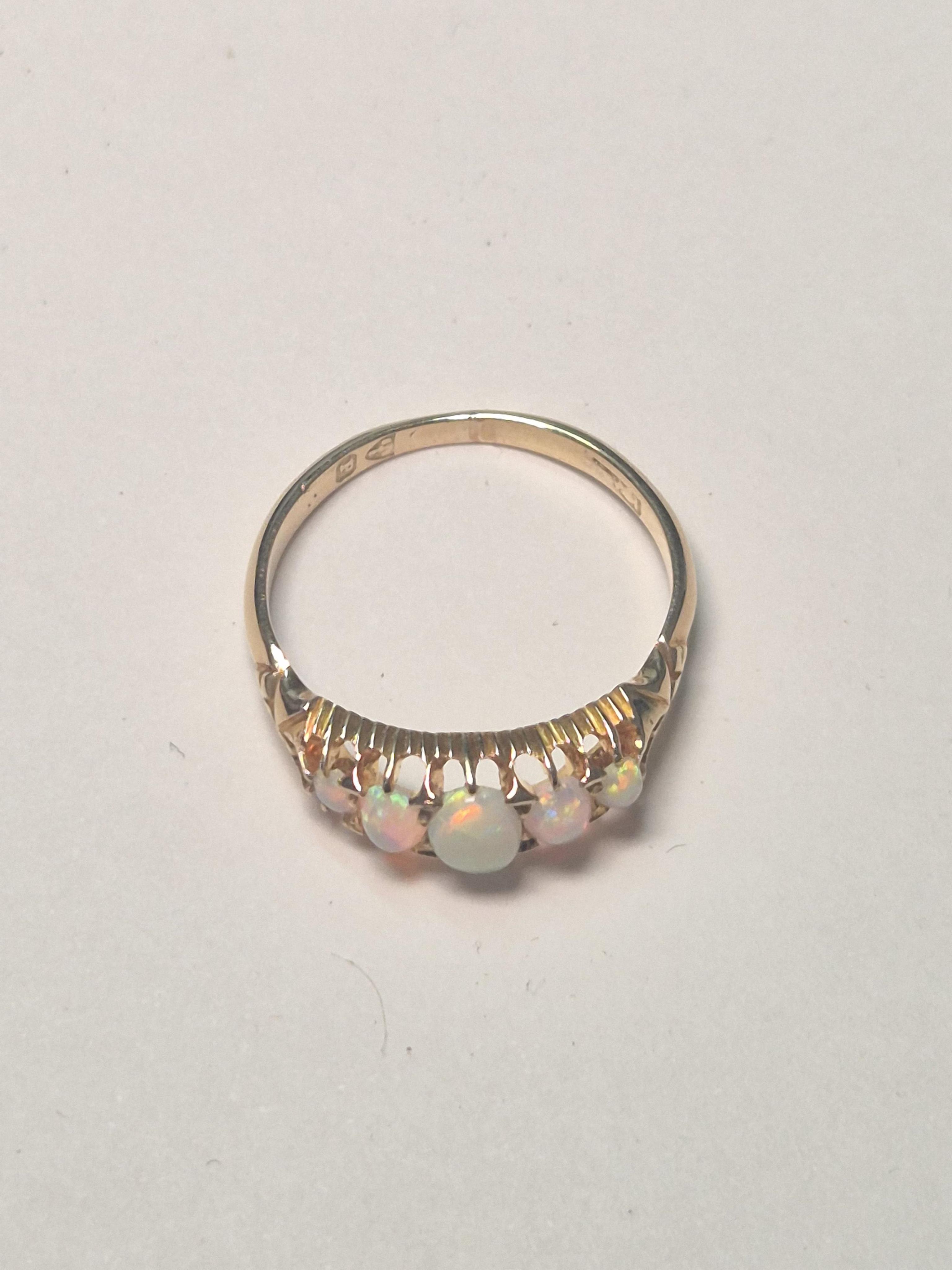 Lot 913 , A late Victorian gold and graduated oval opal set five stone half hoop ring, size O.