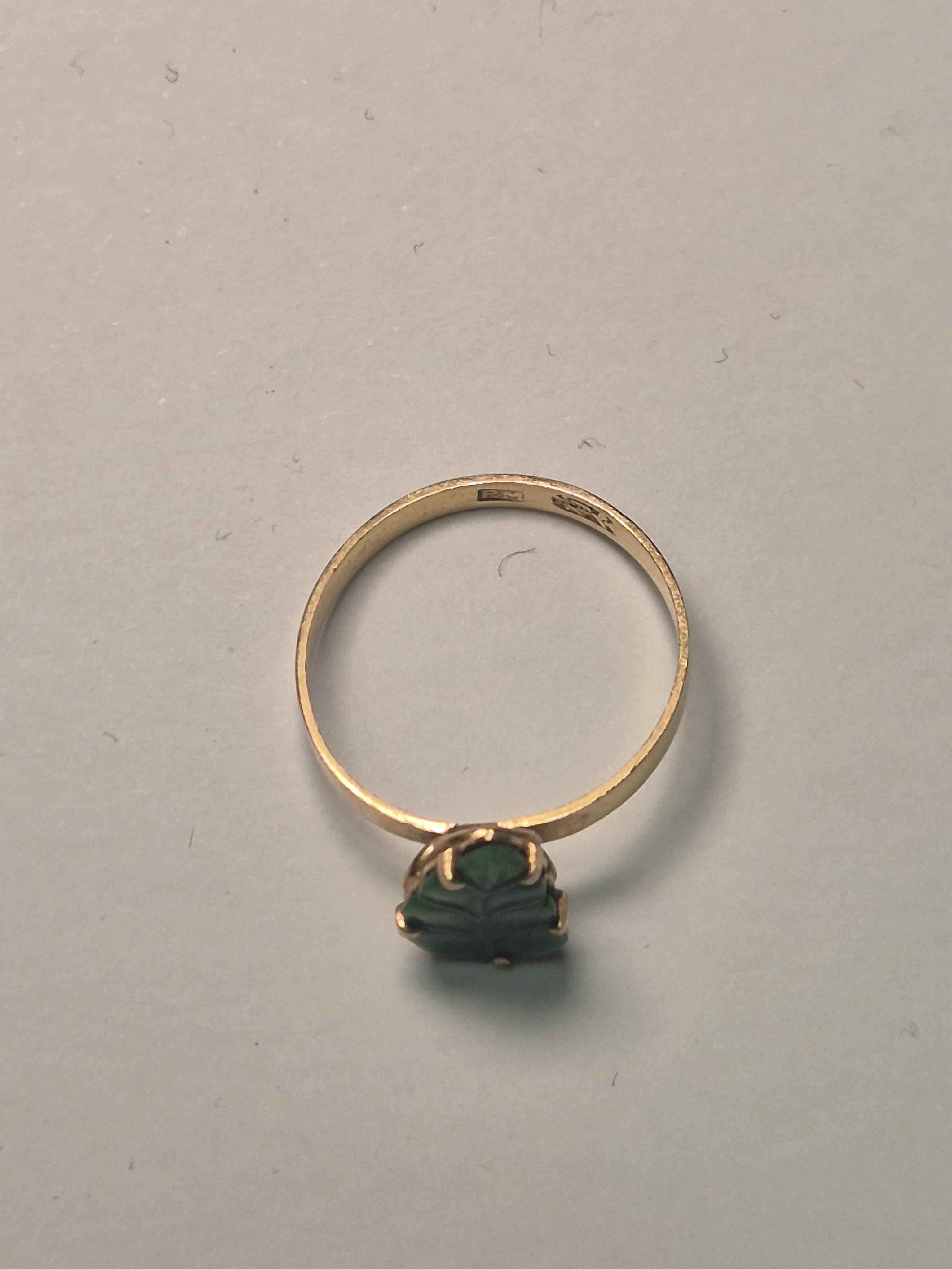 Lot 915 , A Chinese yellow metal and jadeite set ring, the stone carved as a leaf, size M, stamped P.M with Chinese character mark to shank interior.