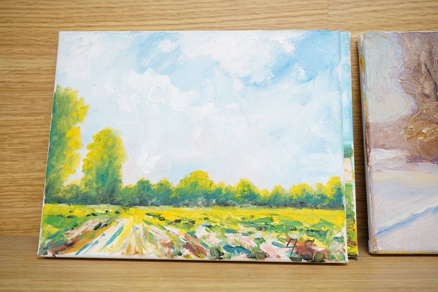 Contemporary, four small landscape and abstract oils on canvas, one by Rod Norman, winter scene, unframed, 20 x 25cm