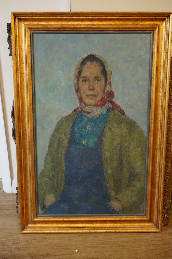 Grigori Izrailevich Tseitlin (Russian, 1911-1999), oil on board, Impressionist half length portrait of a lady, unsigned, label verso, 77 x 47cm