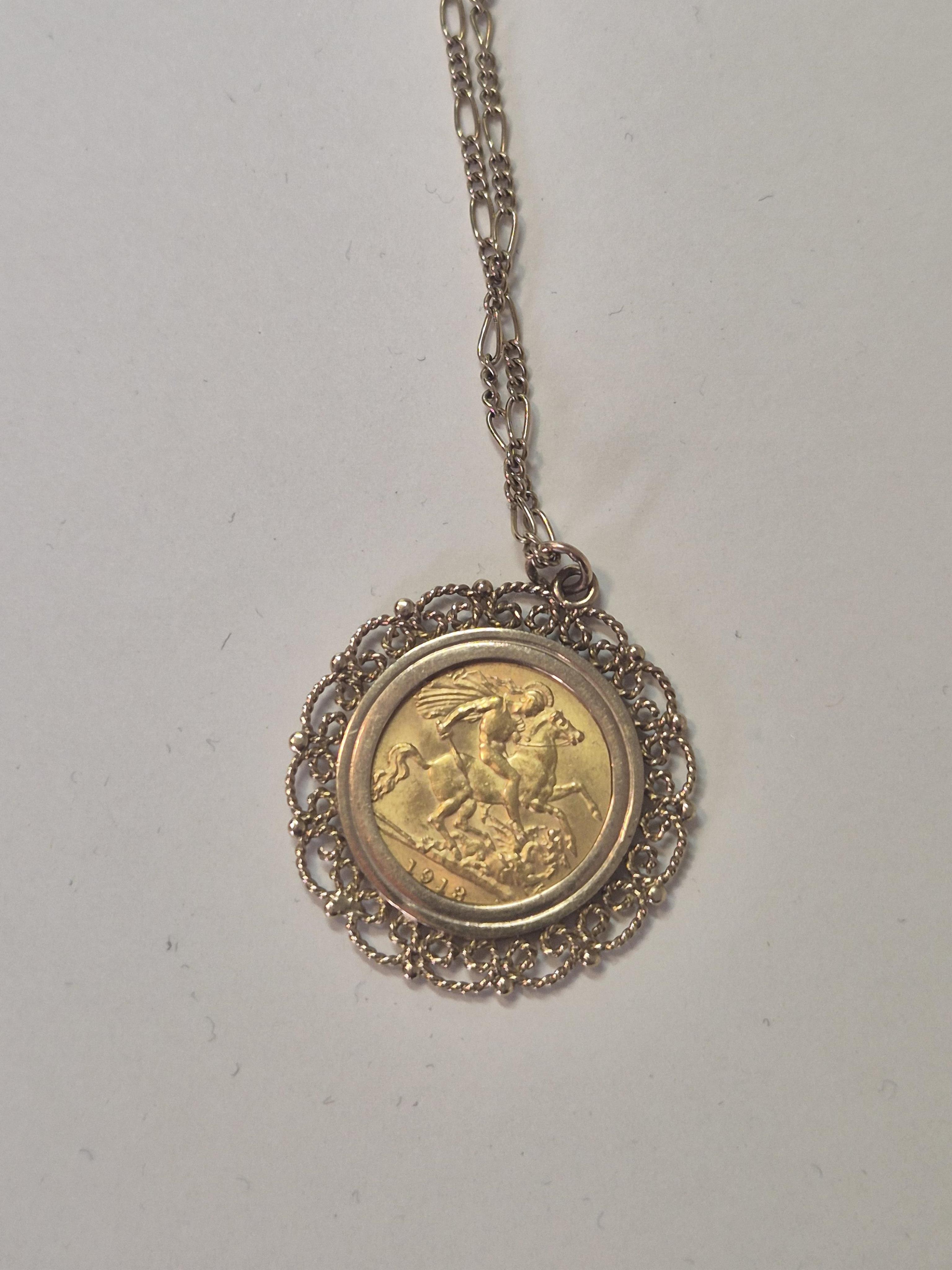 Lot 909 , A George V 1913 gold half sovereign, later mounted in a 1970's 9ct gold pendant mount, on a 9ct chain, chain length 52cm, gross 9 grams.