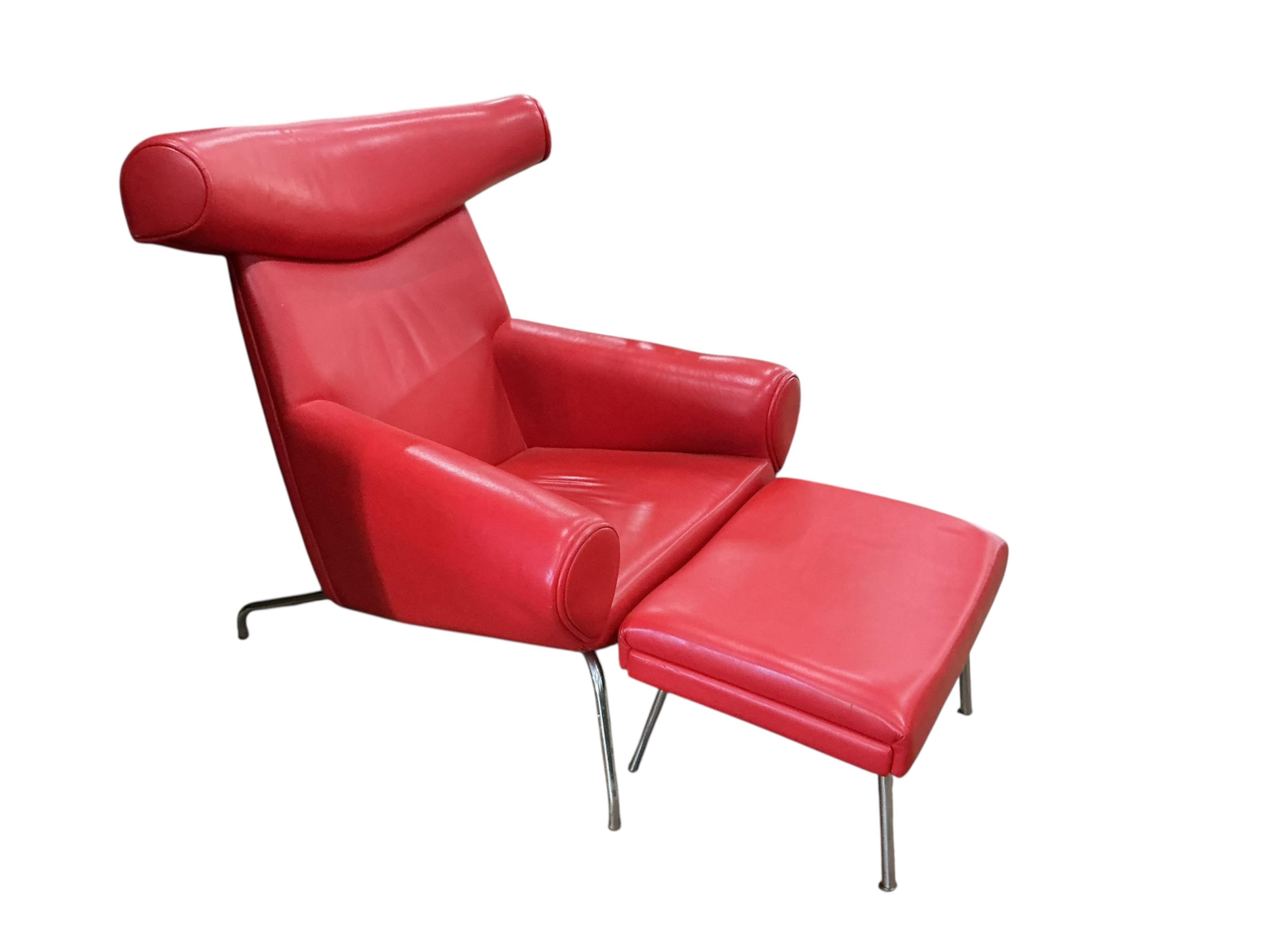 A mid century 'ox' style chair, width 98cm, depth 95cm, height 101cm and footstool