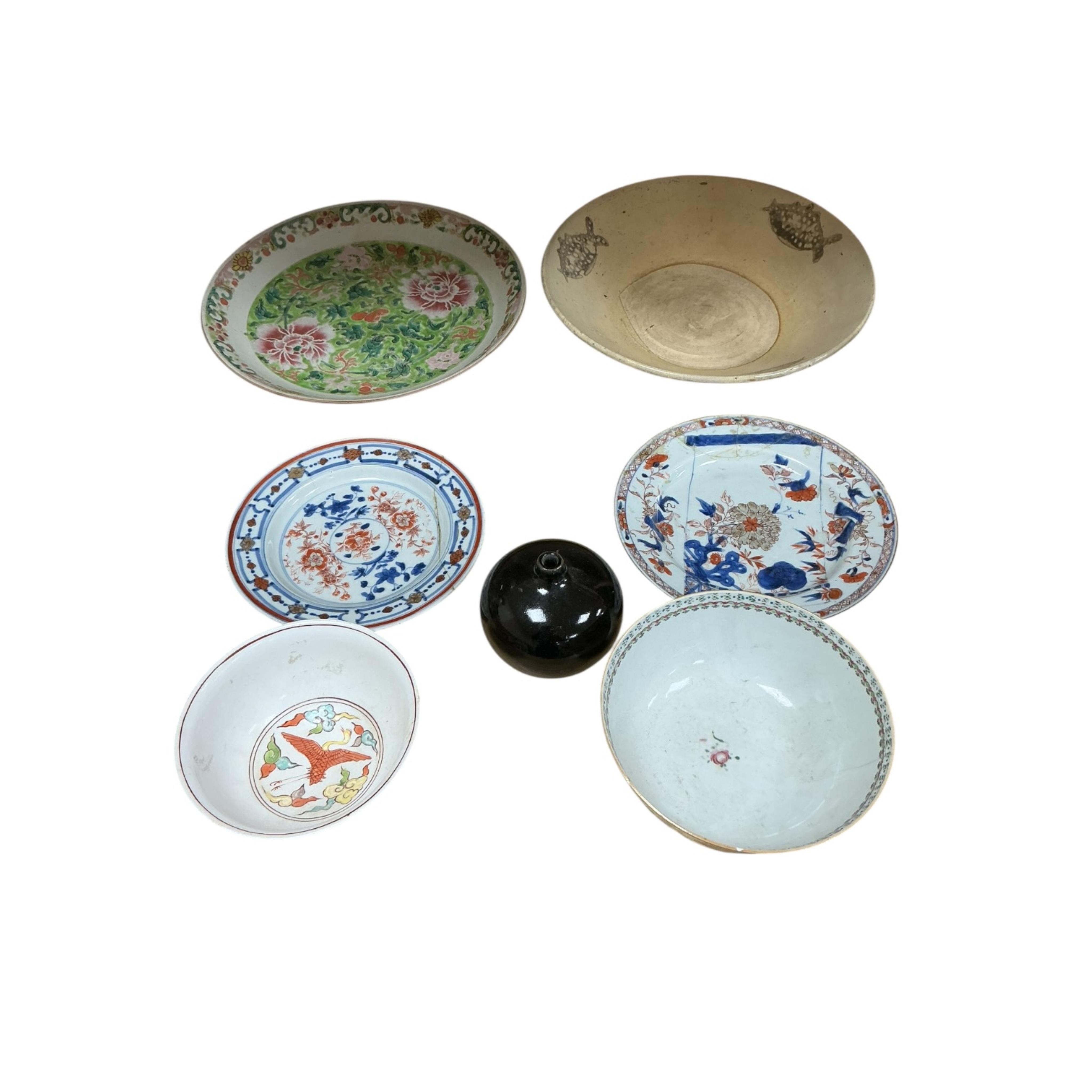 A group of Chinese enamelled porcelain wares, 18th-20th century, to include a Chinese Straits dish, Qianlong bowl, eight tea bowls, a dragon bowl etc., largest bowl diameter 32cm.
