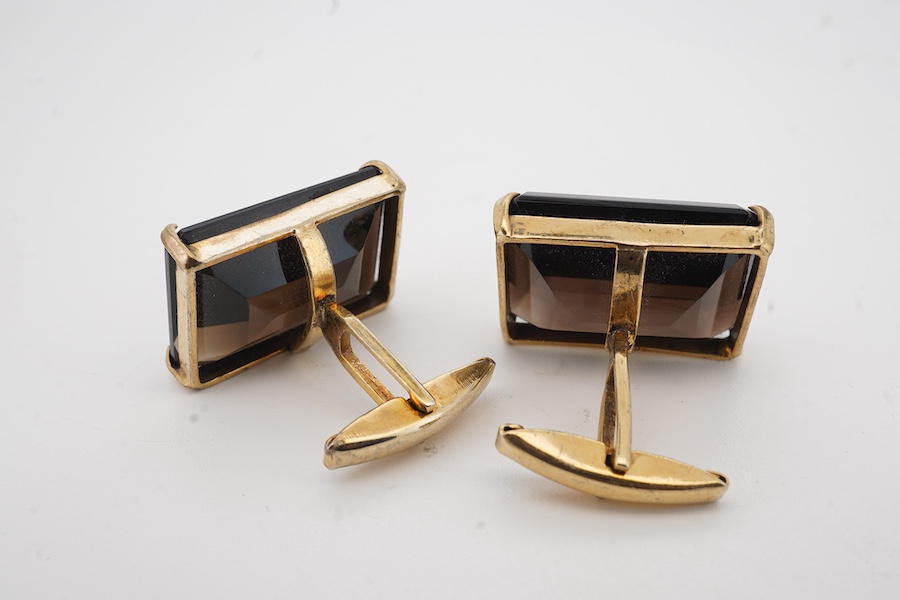 A pair of gilt metal and smoky quartz cufflinks, each set with a step-cut smoky quartz, to baton backs, measuring 2.3 x 1.6cm, combined gross weight approximately 16 grams