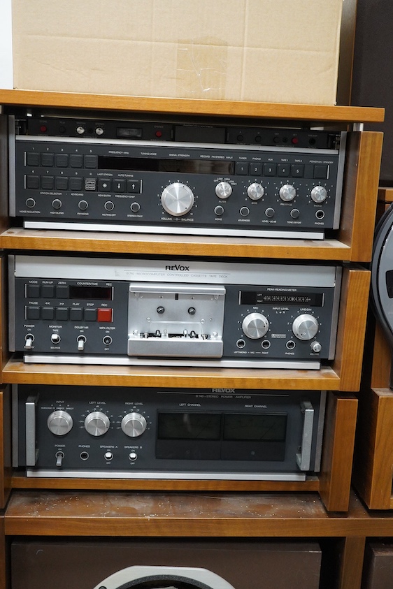 A Revox B77 Mk.II reel-to-reel Stereo Tape Recorder, a Revox B740 Stereo Power Amplifier, a Revox B739 FM Tuner Preamplifier, and a Revox B710 Cassette Tape Deck, contained within a wood effect rack system, and a pair of Revox Satelite speakers for Triton-B, plus a selection of leads and accessories