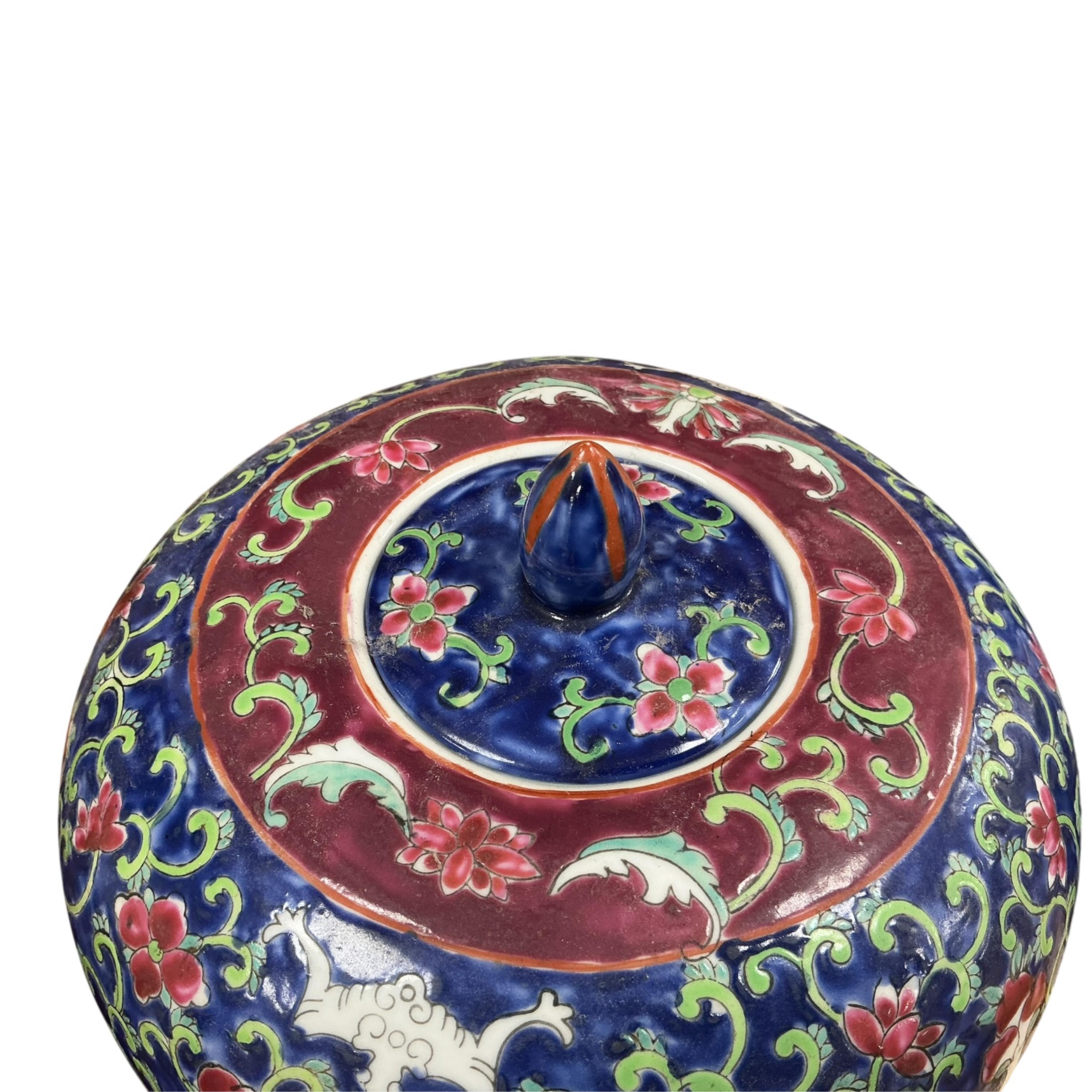 Lot 441 , A pair of Chinese blue ground famille rose ovoid jars and covers, height(s) 29cm.