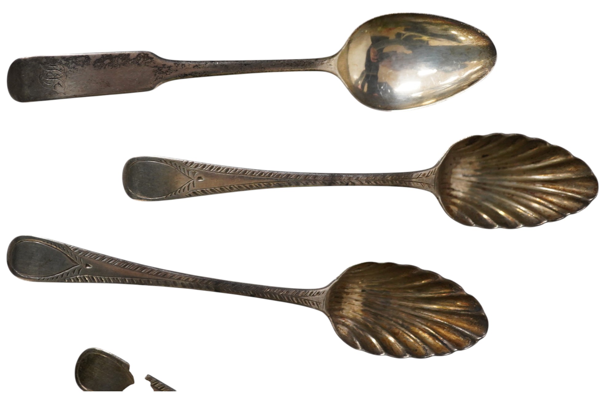 Lot 3829 , Four George III engraved Old English pattern silver shell bowl teaspoons, London, 1794 and six other silver teaspoons including four George III, George Gray, London, 1793 and Art Nouveau enamelled, probably James Fenton,
