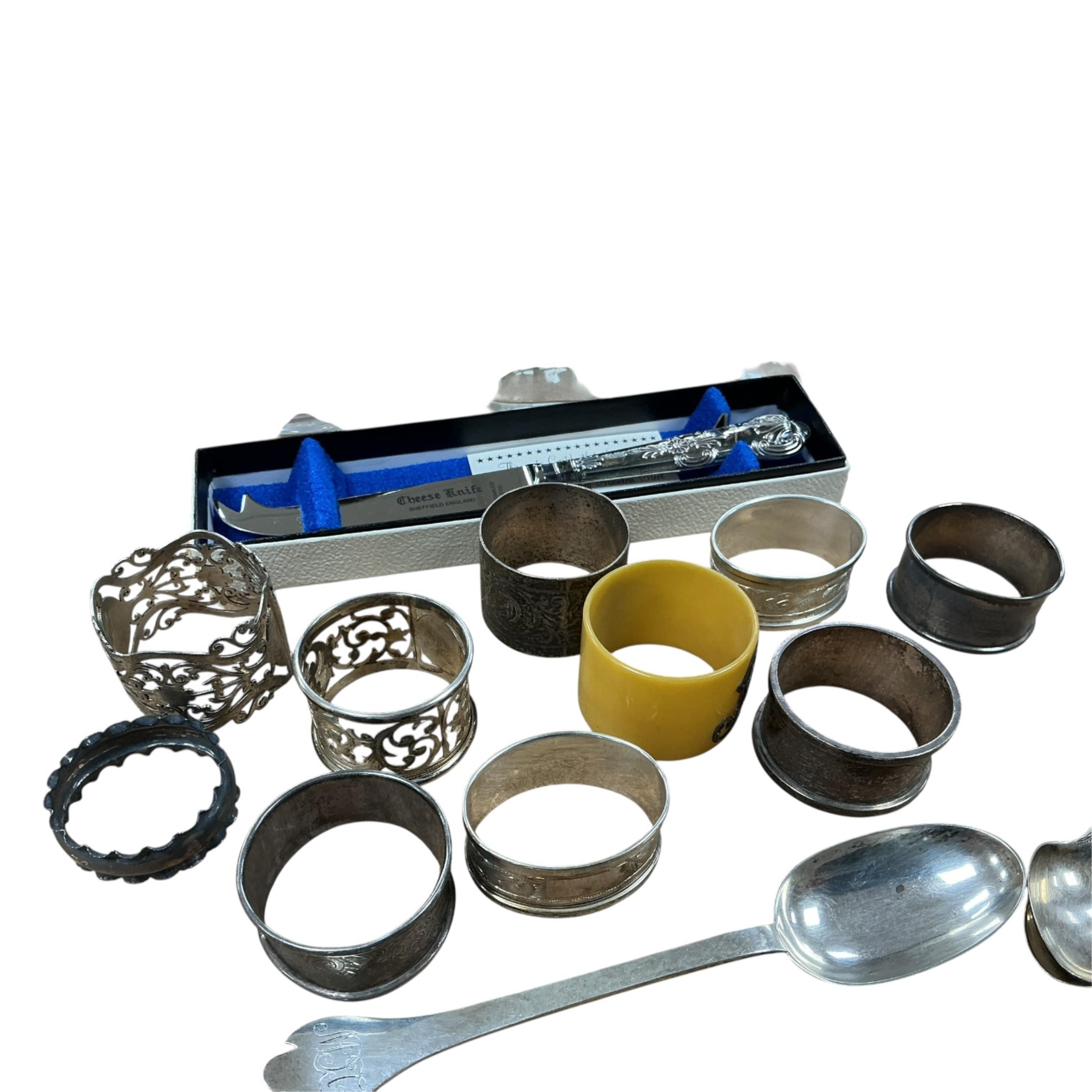 A small collection of assorted silver and other napkin rings, silver spoons including modern trefid and other items including toilet jars.