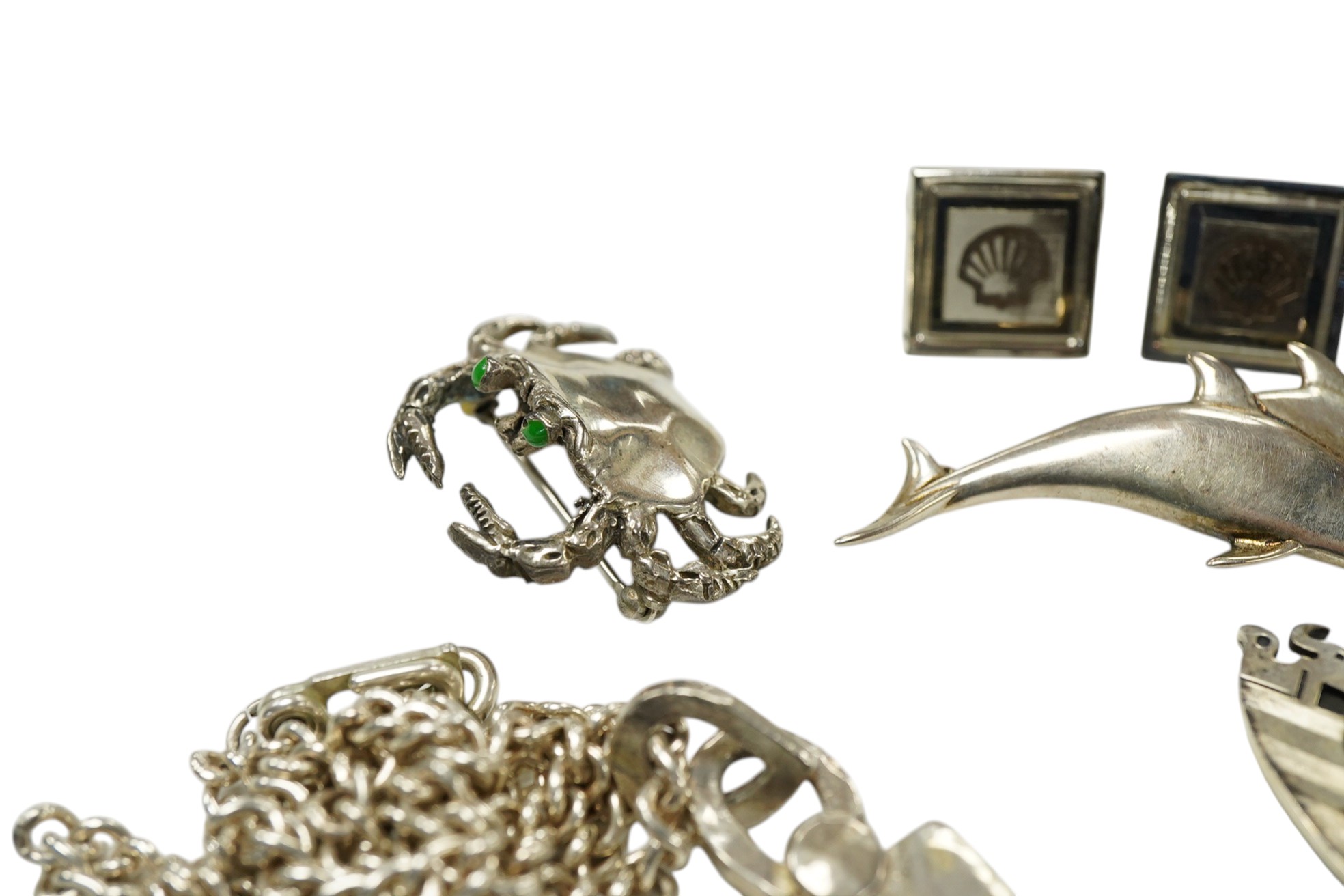 A collection of jewels, comprising: a silver ingot pendant on a white metal chain; three silver brooches designed as a crab, Noah's Ark and two dolphins respectively; a blue paste dress set; and a pair of silver cufflinks bearing the Shell logo, British hallmarks