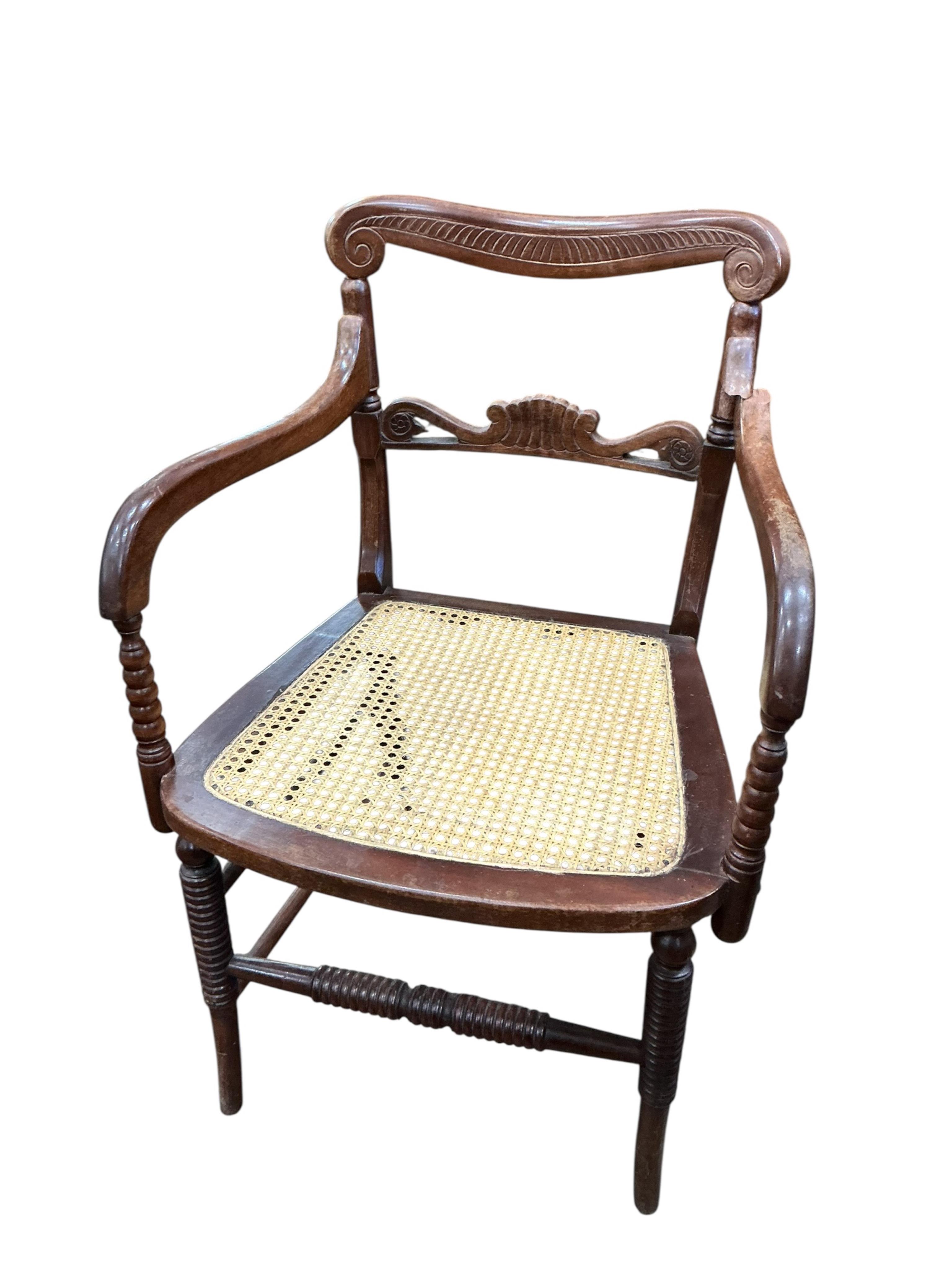 A set of six reproduction Regency style mahogany elbow chairs, the dipped crest rails over scrolled spars and caned seats with squab cushions on turned underframes, width 54cm, depth 48cm, height 79cm