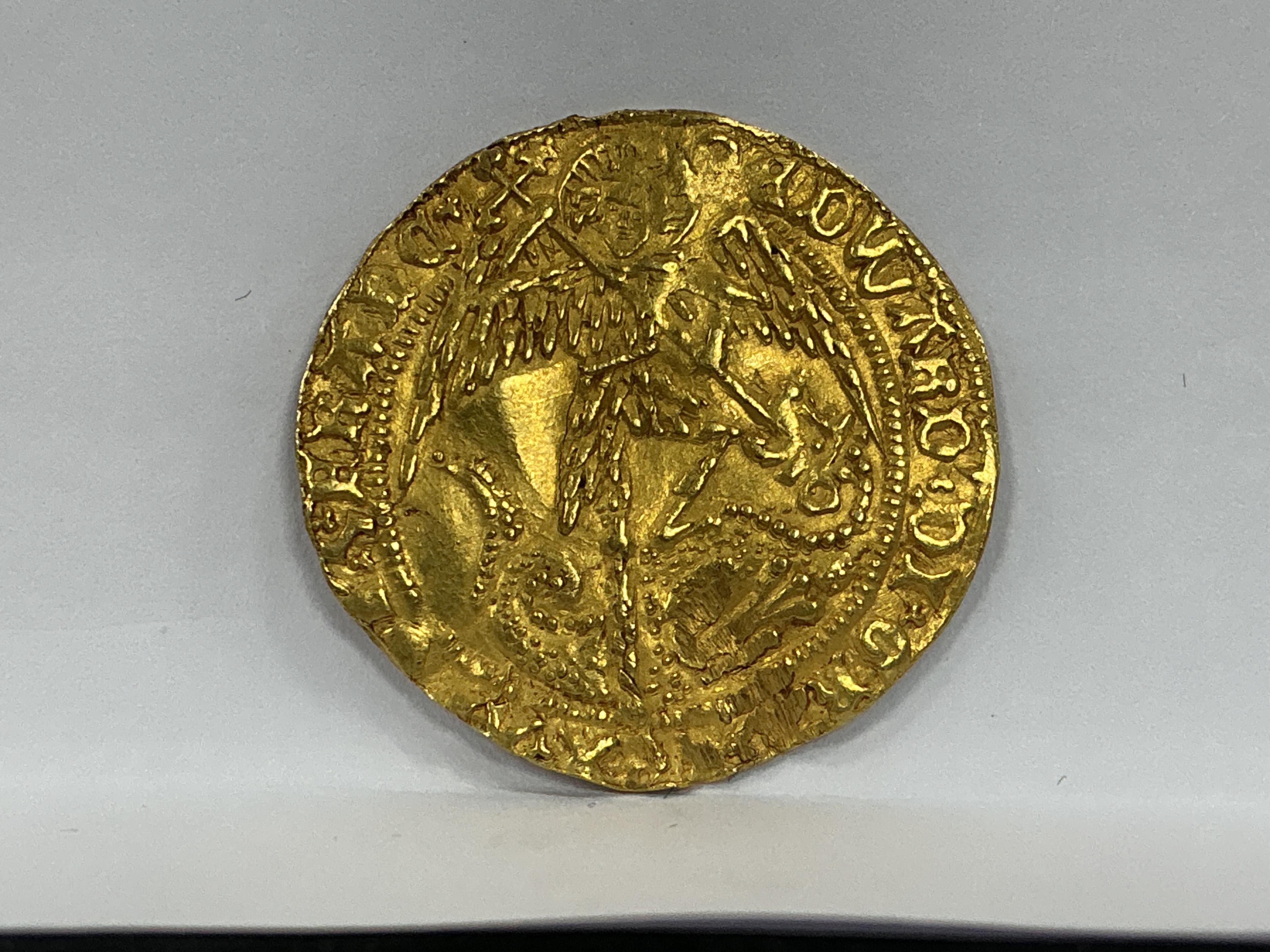 Lot 2089 , British hammered gold coins, Edward IV, second reign (1471-83), gold Angel, Tower Mint, London, S 2091, approx. 5.1g, St Michael killing dragon with lance, one foot on dragon, beaded circle surrounding, initial mark annu