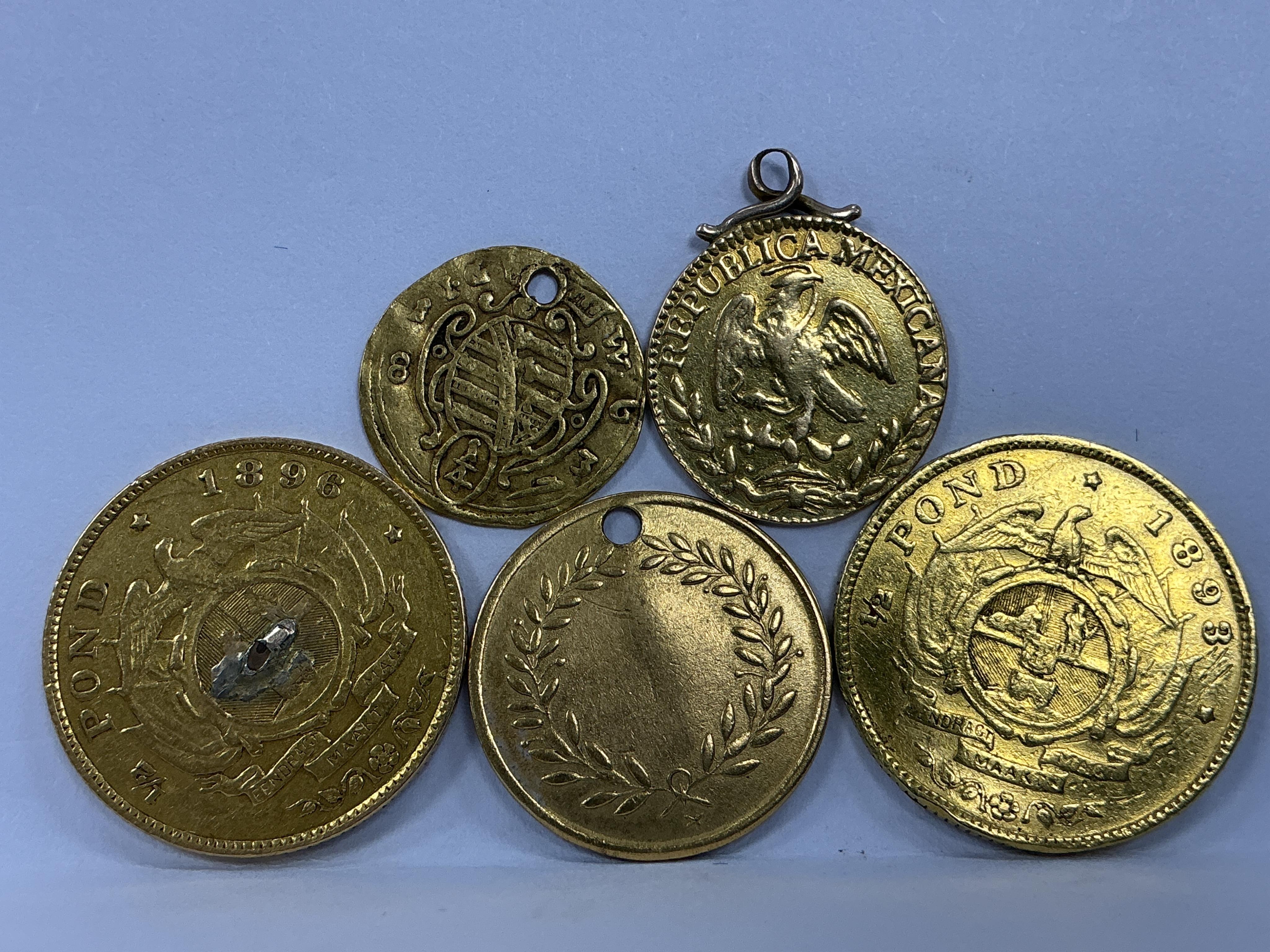 World gold coins and medals; two South Africa gold half pond, 1893 and 1896, demounted, 7.9g gross, Republic of Mexico gold half escudo, 1825, mounted, 1.72g gross, Friedrich I gold 1/4 ducat, 1683, holed, 0.84g, the Lord’s prayer gold medal, holed, 0.88g (in total approx. 11.35g gross)