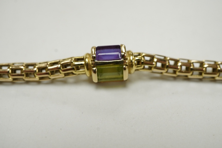 A gold and multi-gem bracelet, the cylindrical chain spaced with cylindrical beads set with step-cut citrines, peridots, amethysts and blue topazes, in gold, length 18.5cm, indistinctly marked, clasp deficient, gross weight approximately 9.5 grams