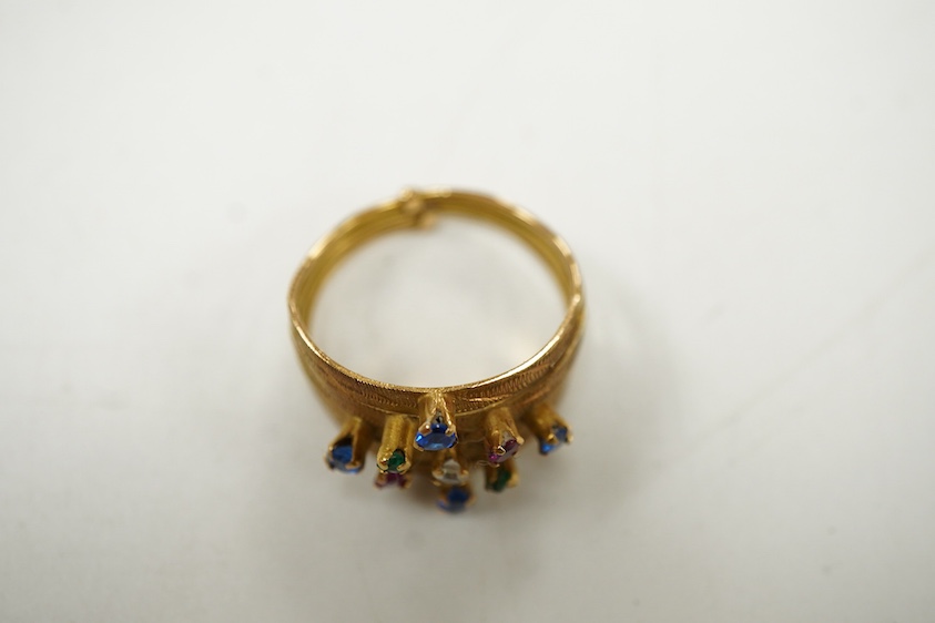 A 'harem' ring, composed of conjoined gold bands set with multicoloured circular-cut pastes, size Q1/2, Egyptian assay marks, gross weight approximately 4 grams