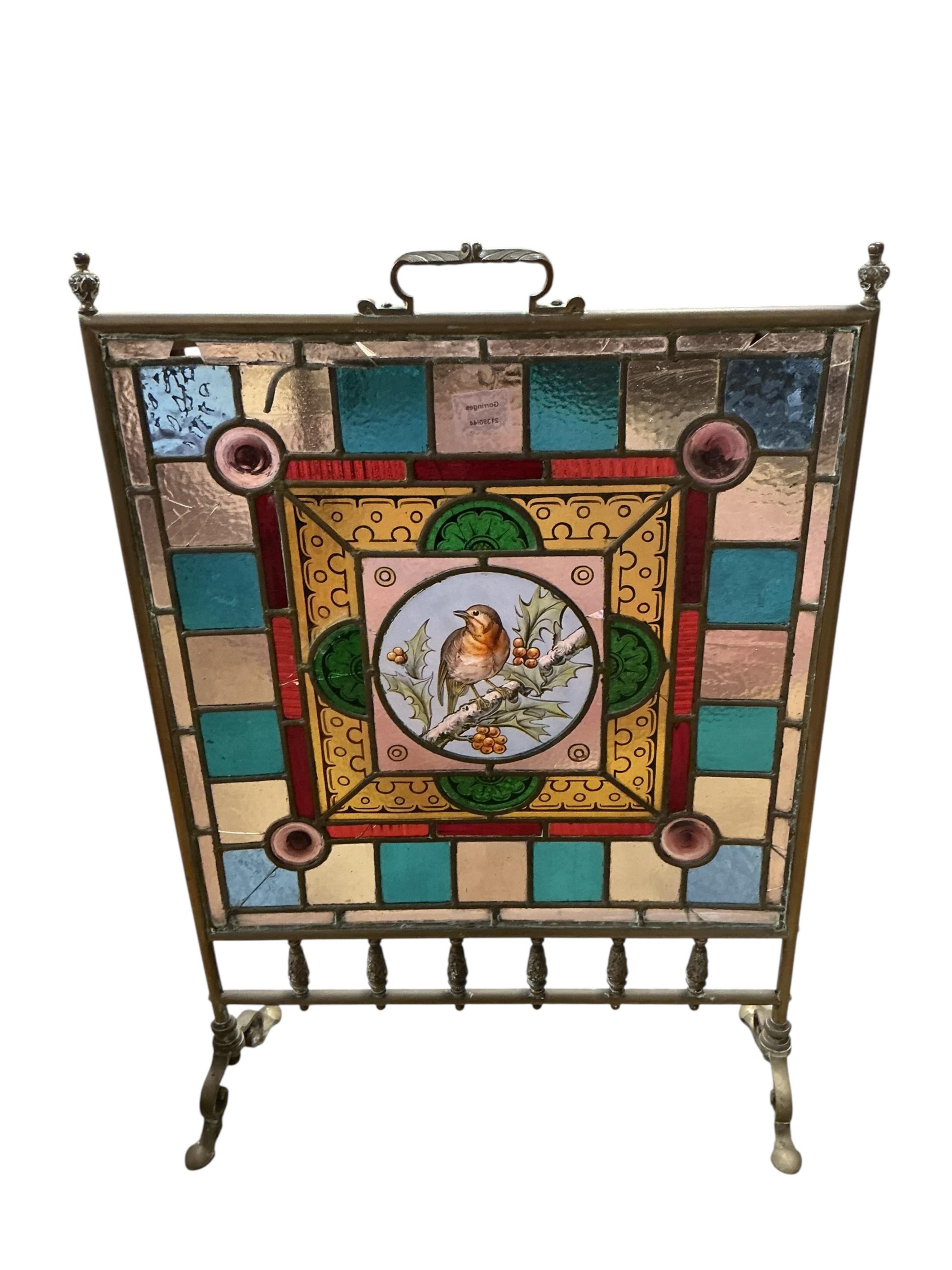 Lot 3445 , A late Victorian leaded stained glass fireguard the central panel decorated with a robin, width 54cm, depth 21cm, height 77cm