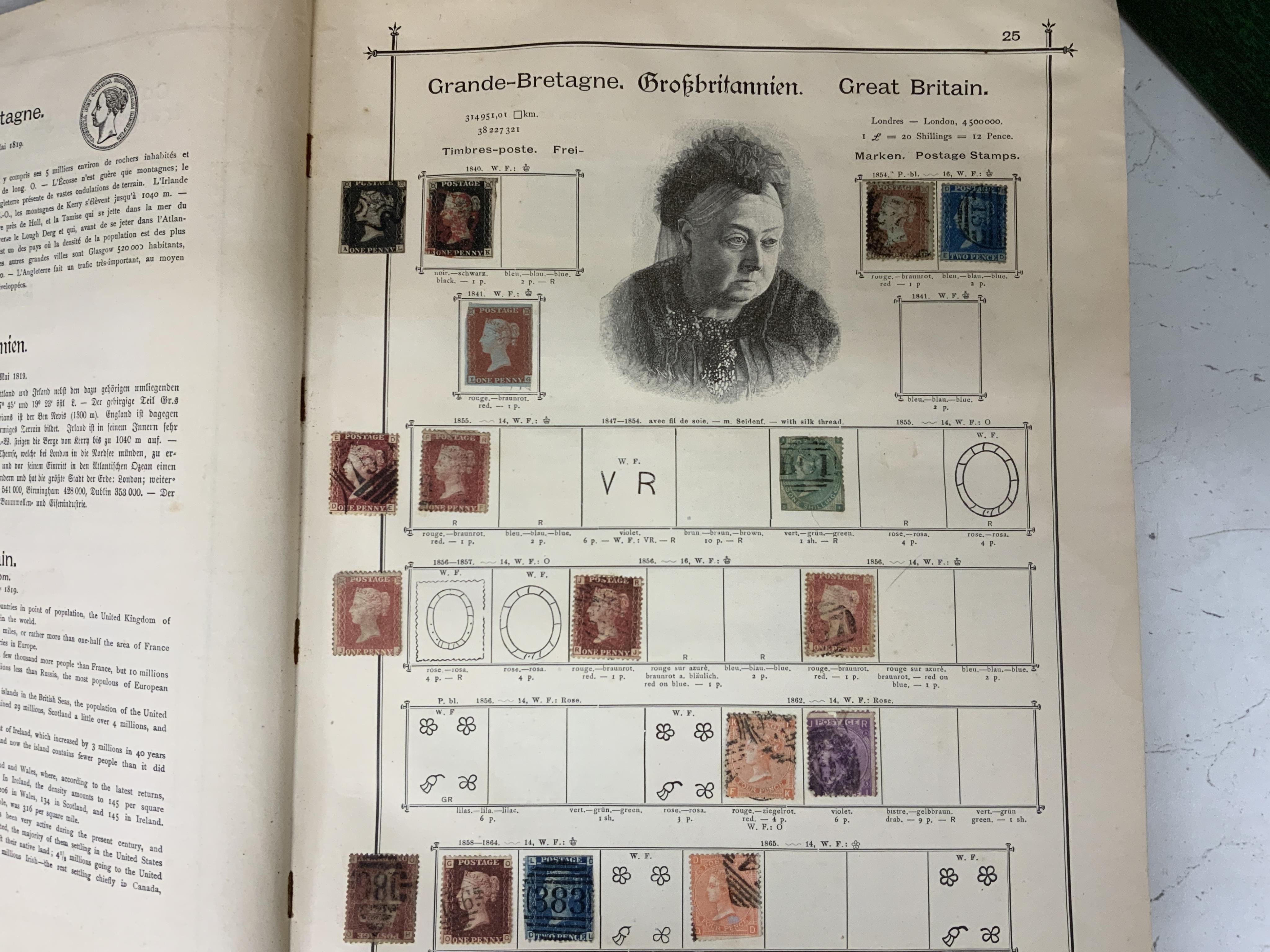 A late 19th century German produced postage stamp album entitled ‘The International Postage Stamp Album’, 16th edition, containing stamps issued from 1840 to 1890, incomplete, but with a selection of world stamps including a Victoria £1 green stamp, two One Penny black stamps, early One Penny red, Two Pence blue, etc., together with five card rolls containing unused full sheets of Elizabeth II stamps and stamp sets as issued by Royal Mail