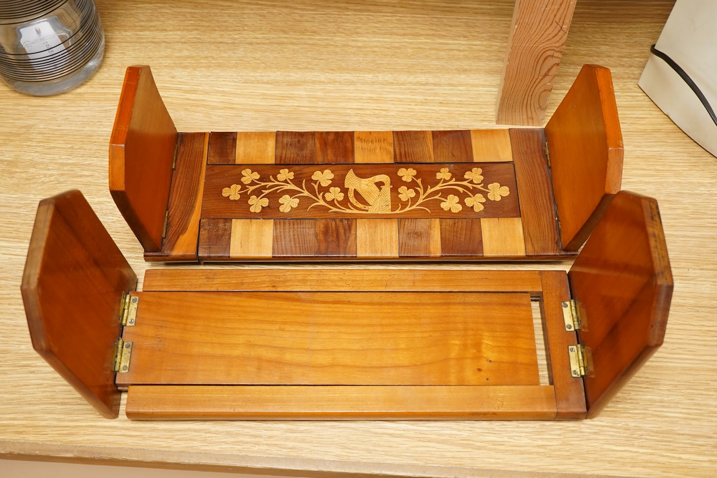 Lot 3601 , A 19th century Killarney marquetry, arbutus wood book slide and a Tunbridgeware cube parquetry book slide.
