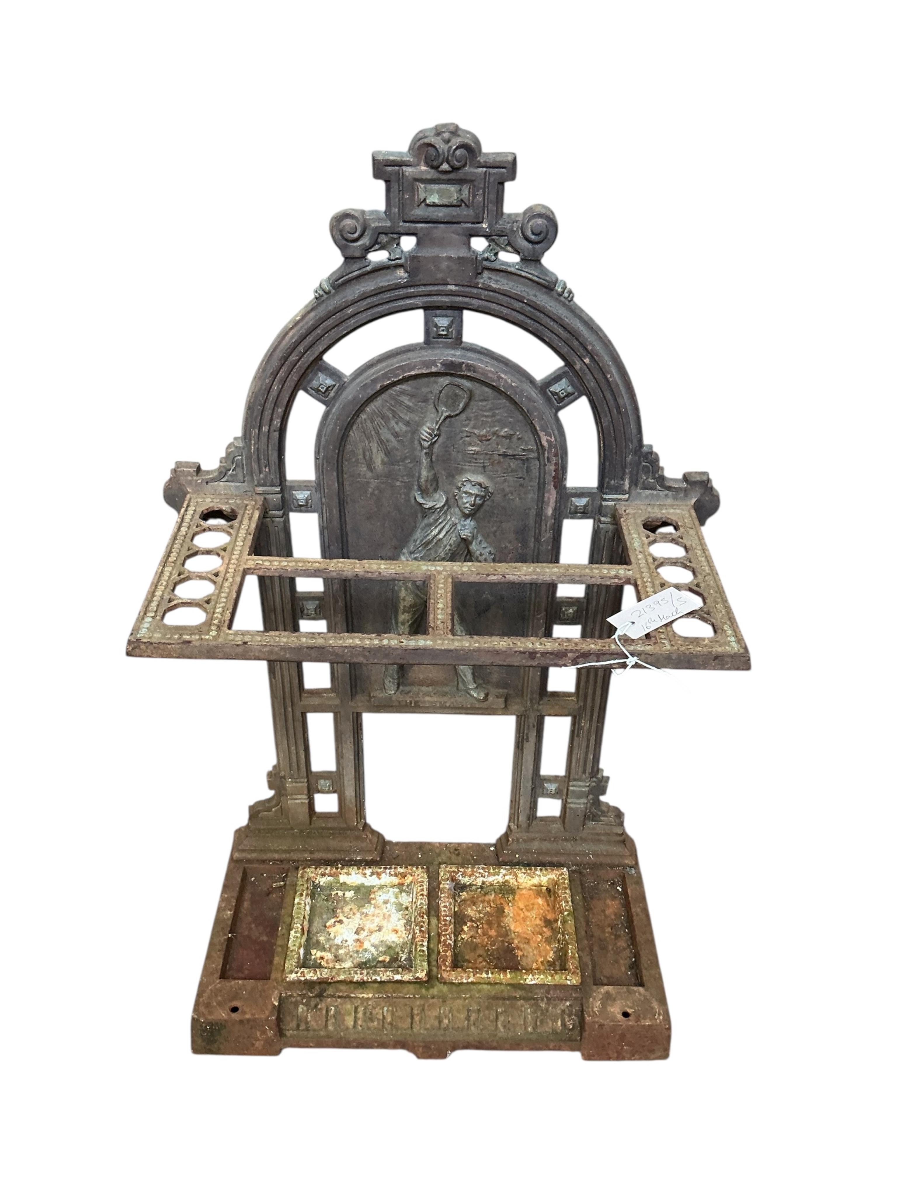 Lot 1081 , A Victorian 'Coalbrookdale' style iron sticktand 'The Smash' cast with a tennis player, width 55cm, 26cm, height 87cm