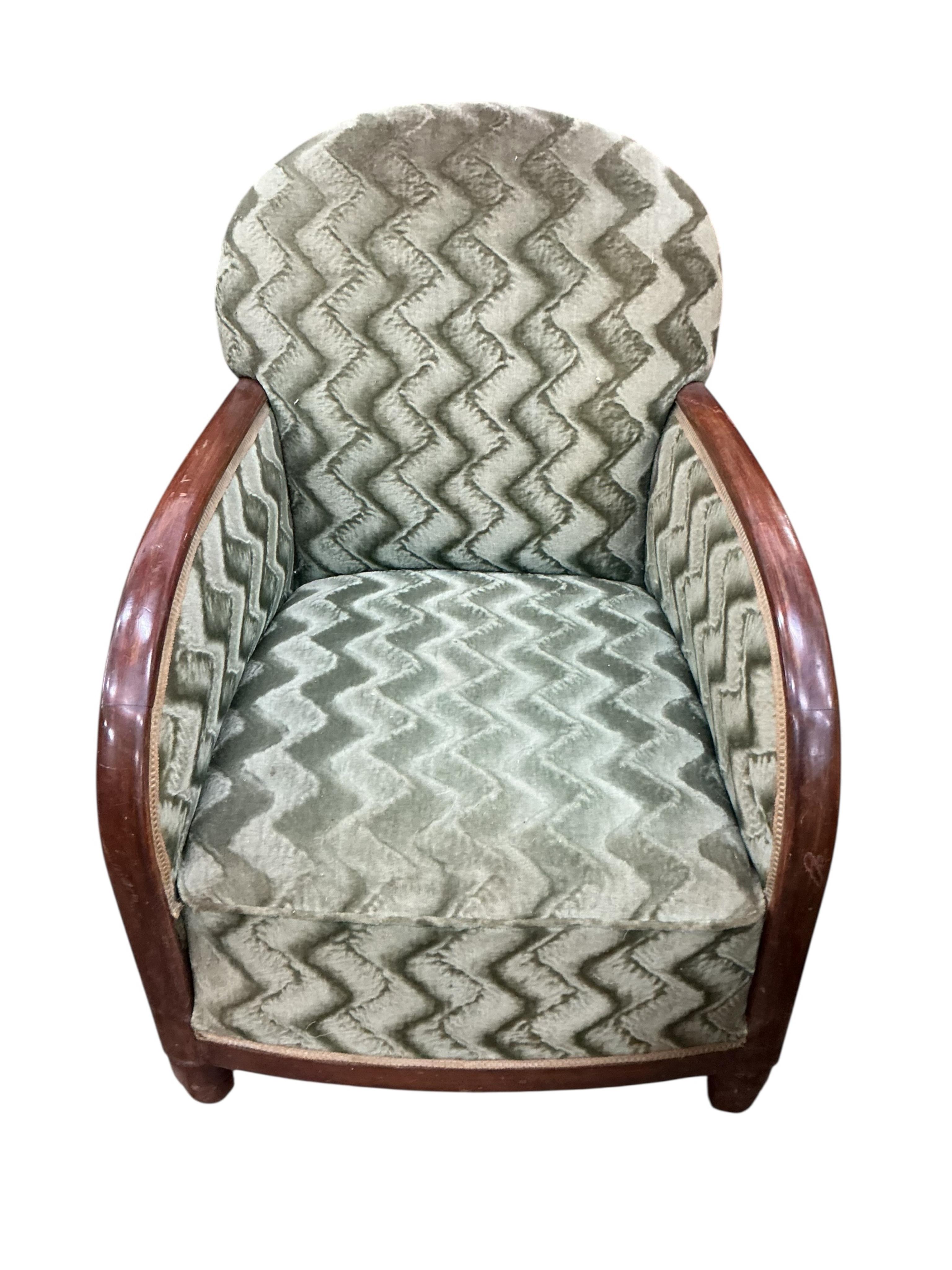 A pair of French Art Deco beech armchairs, width 61cm, depth 65cm, height 80cm