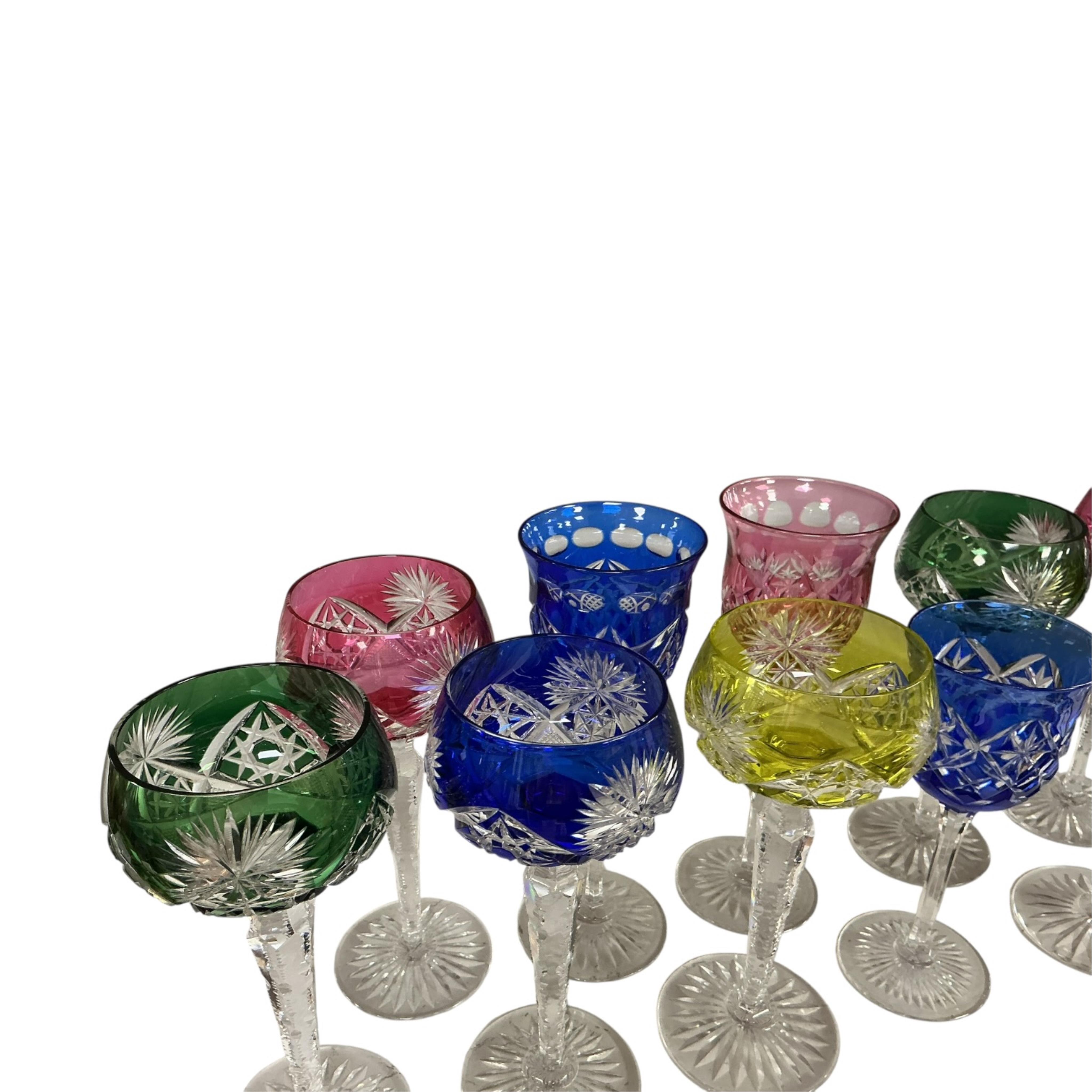 Lot 1328 , A harlequin set of eight colour flashed cut glass hock glasses and three others, tallest 21cm.