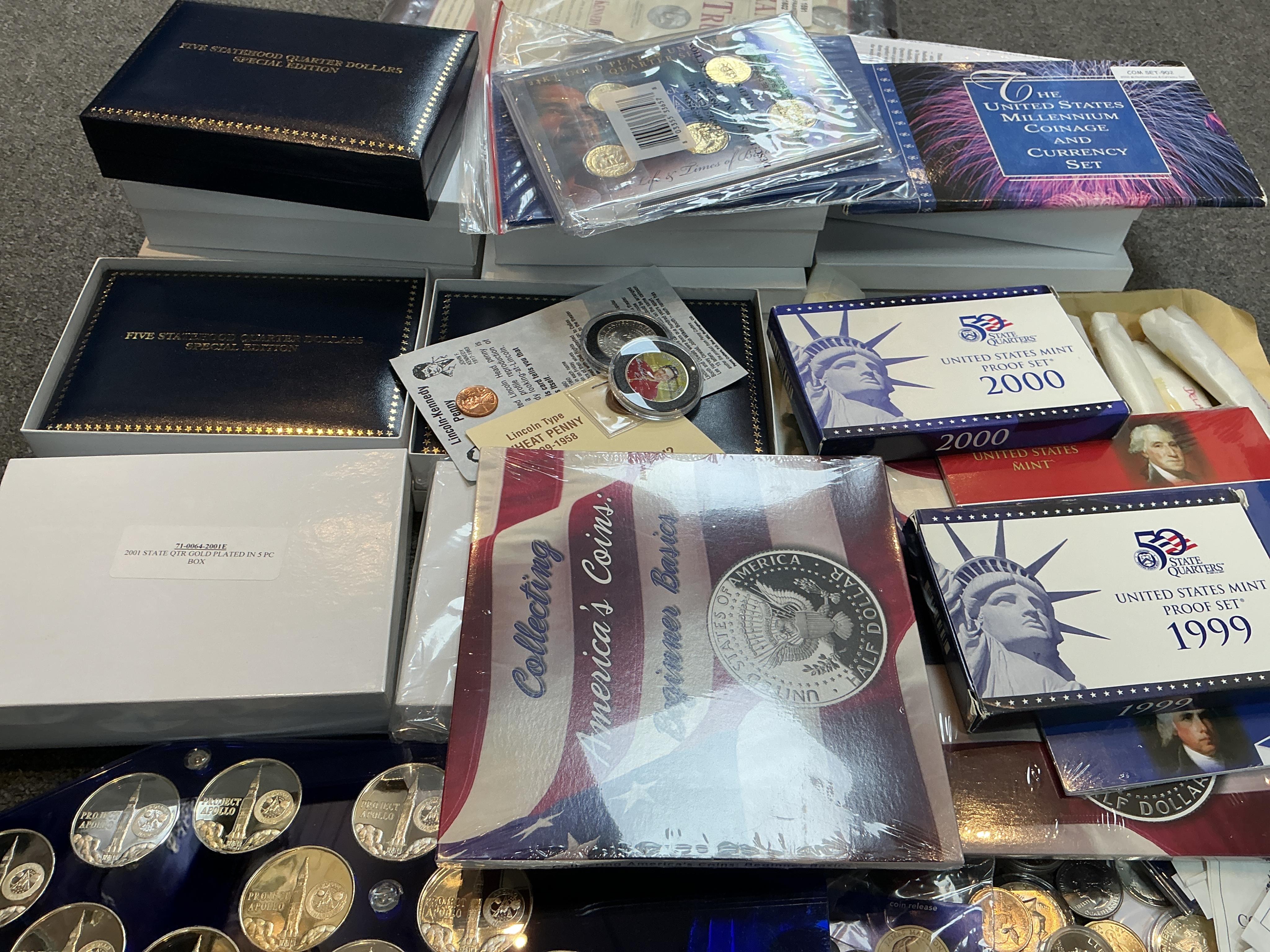 Lot 2018 , USA coins, including a quantity of five statehood quarter dollars special edition sets, mint proof sets from 1999 and 2000, many loose UNC coins etc.