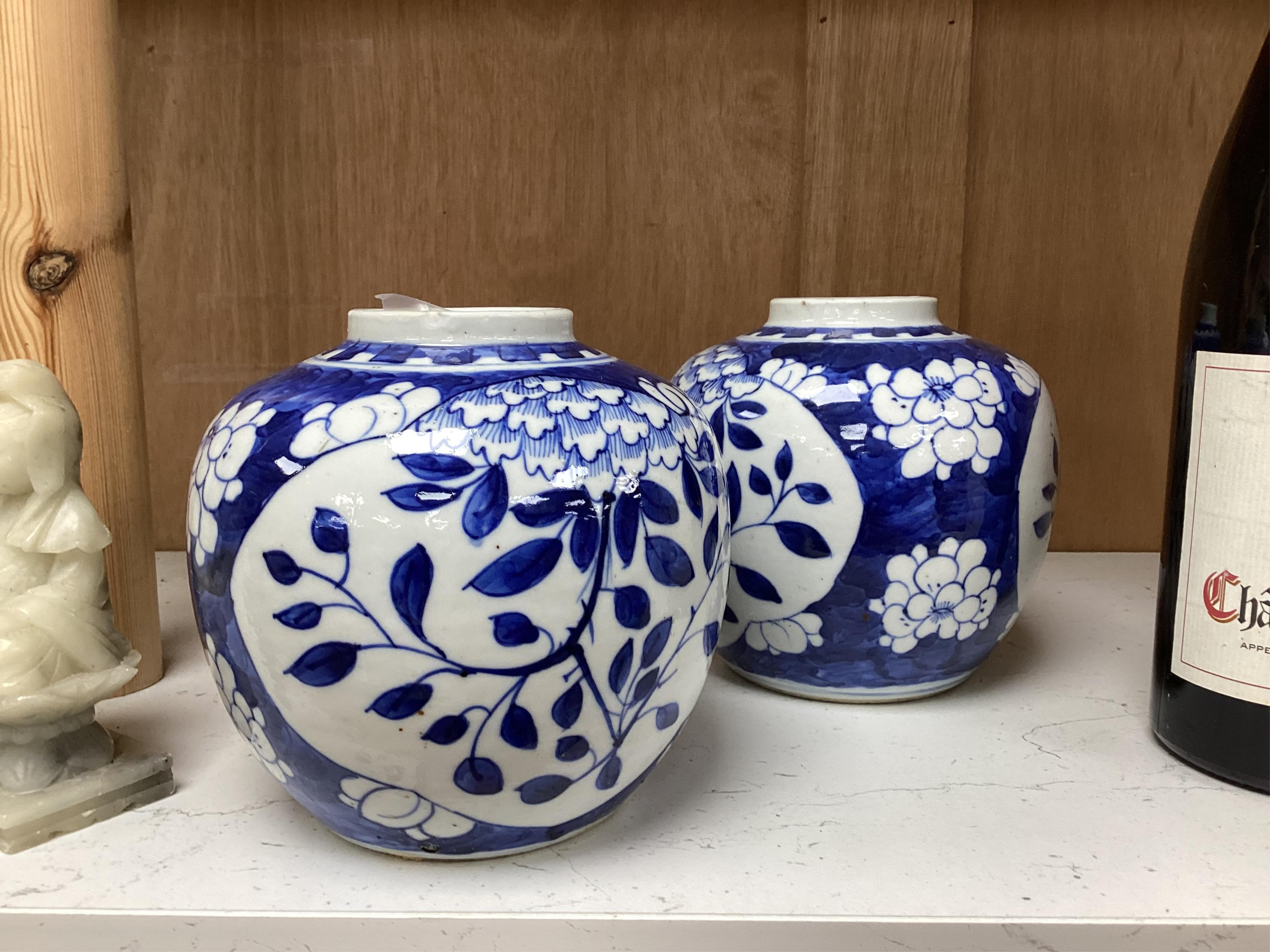 A pair of Chinese blue and white ginger jars and covers, height(s) 15cm.