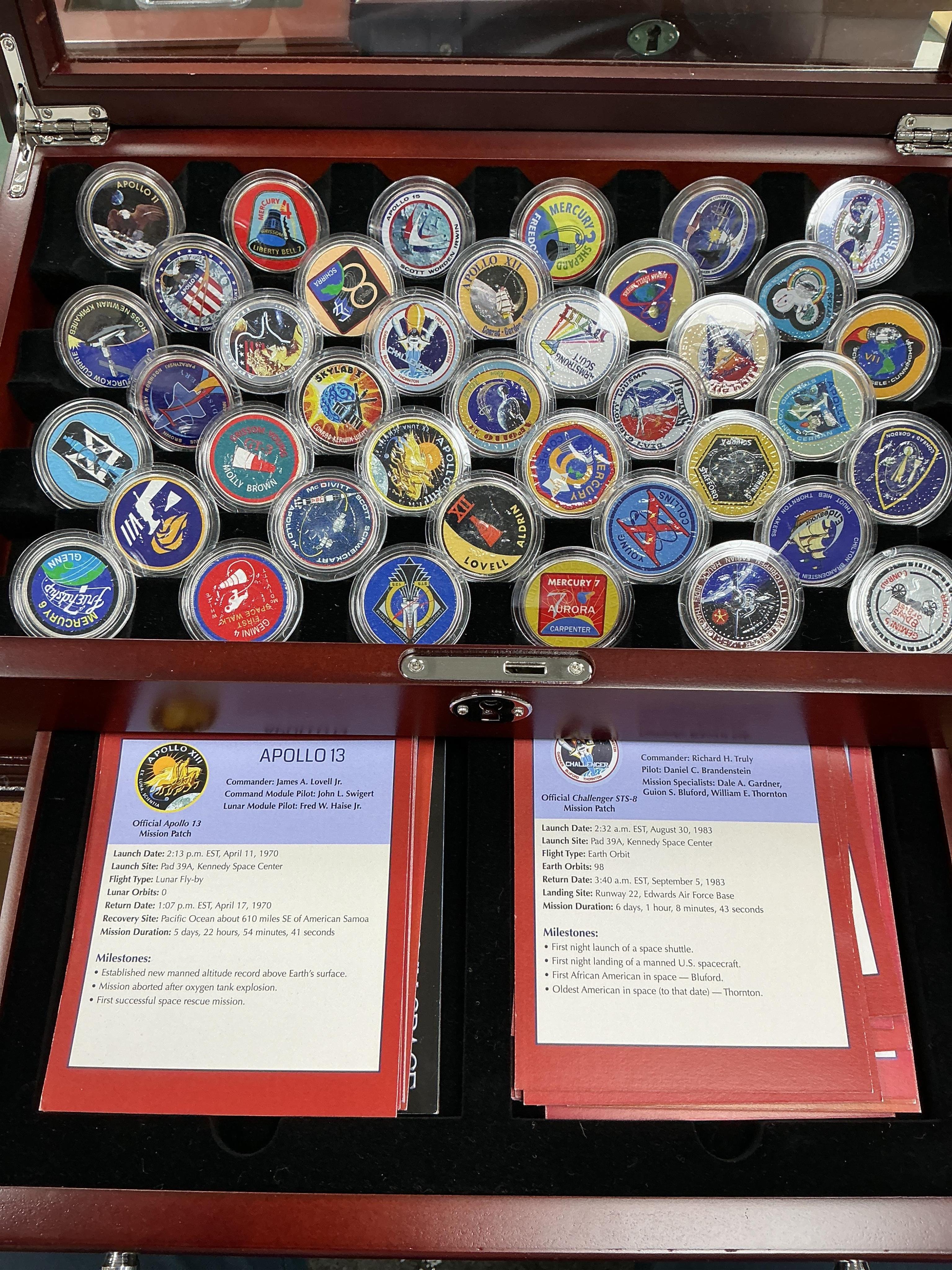 Lot 2025 , United States coins, the achievements in space coin collection incorporating Franklin silver half dollars and Kennedy Silver or cupronickel half dollars, each colourised with NASA logos, in a display case, issued by Danb