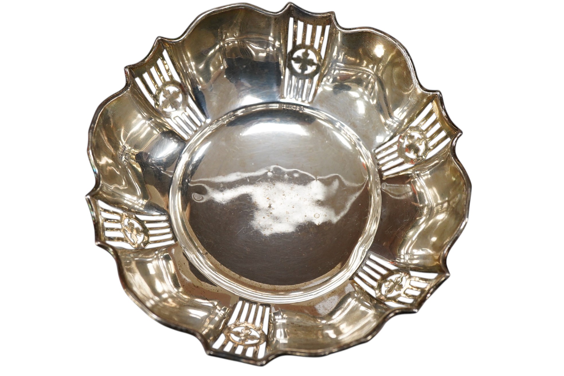 A pair of George V pierced silver bonbon dishes, on three scroll feet, Henry Clifford Davis, Birmingham, 1918, diameter 14cm, 7.2oz.