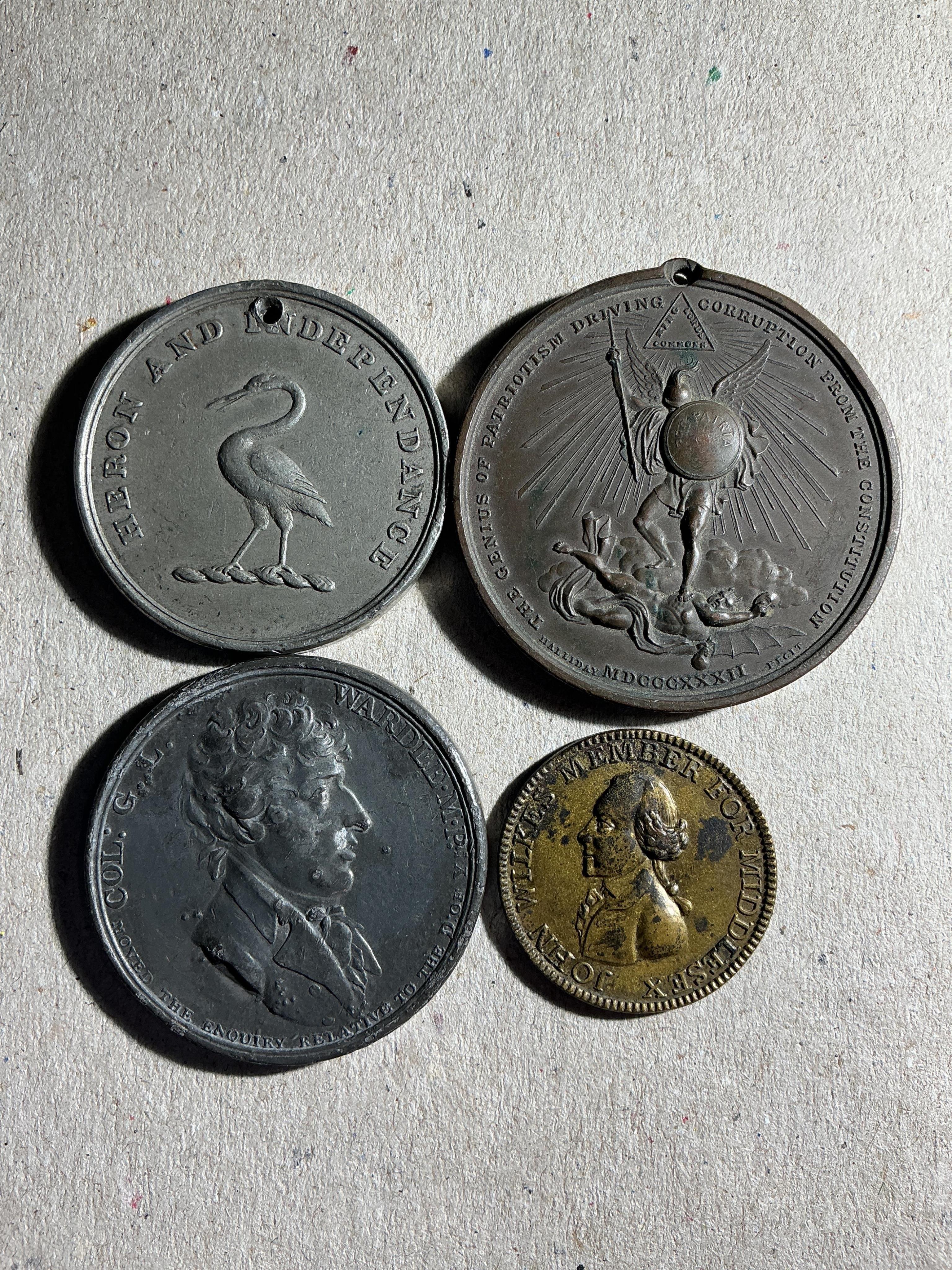 Lot 2153 , British political Medals, 18th/19th century, John Wilkes (1727-97), Member for Middlesex 1768 halfpenny-sized political brass medalet, bust of Wilkes, VF, Col. Wardley MP soft metal medal, 1800, Lincoln County election 2