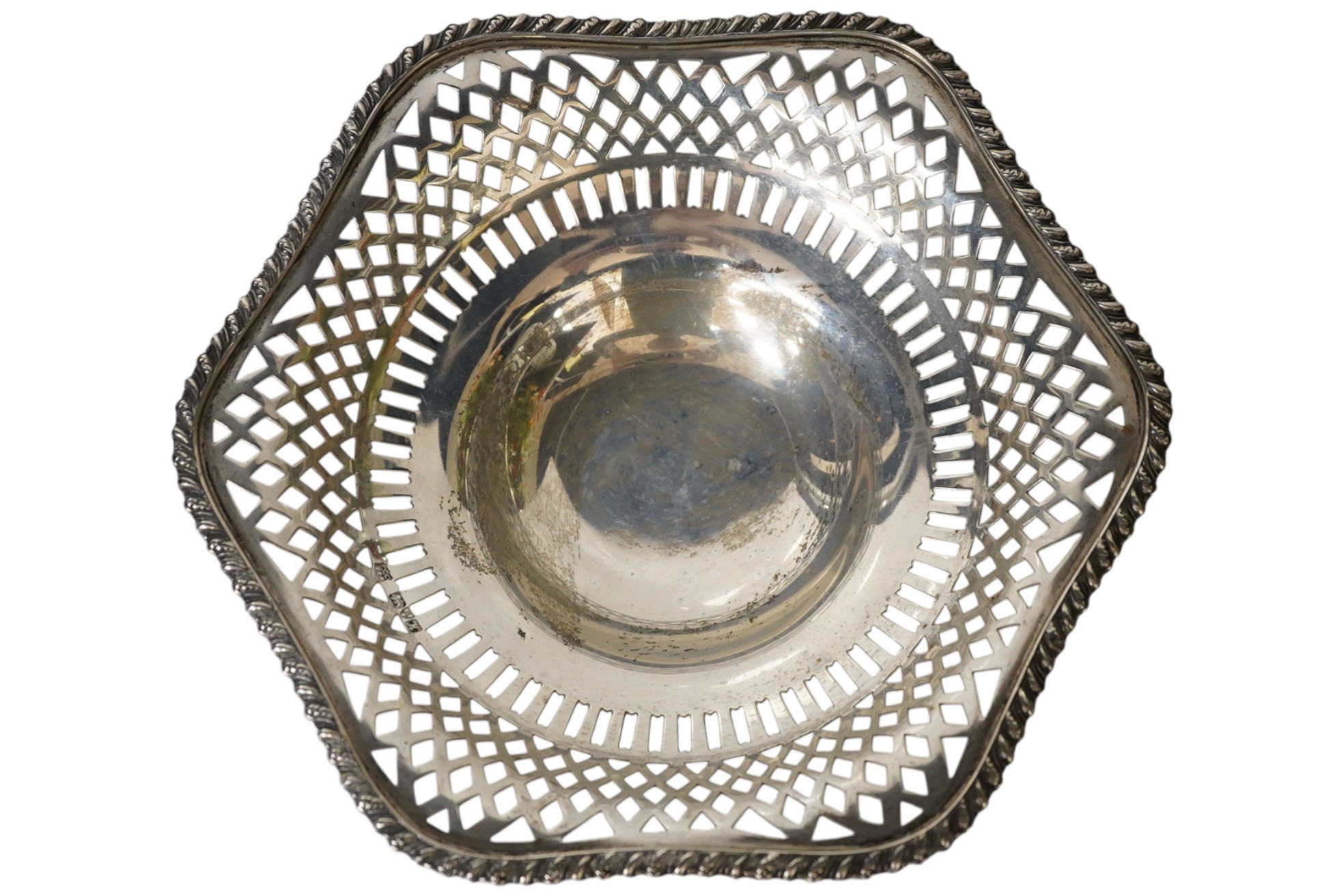 Lot 3849 , A George V pierced silver hexagonal pedestal bowl, Barker Brothers, Chester, 1910, diameter 19.5cm, 11.6oz.