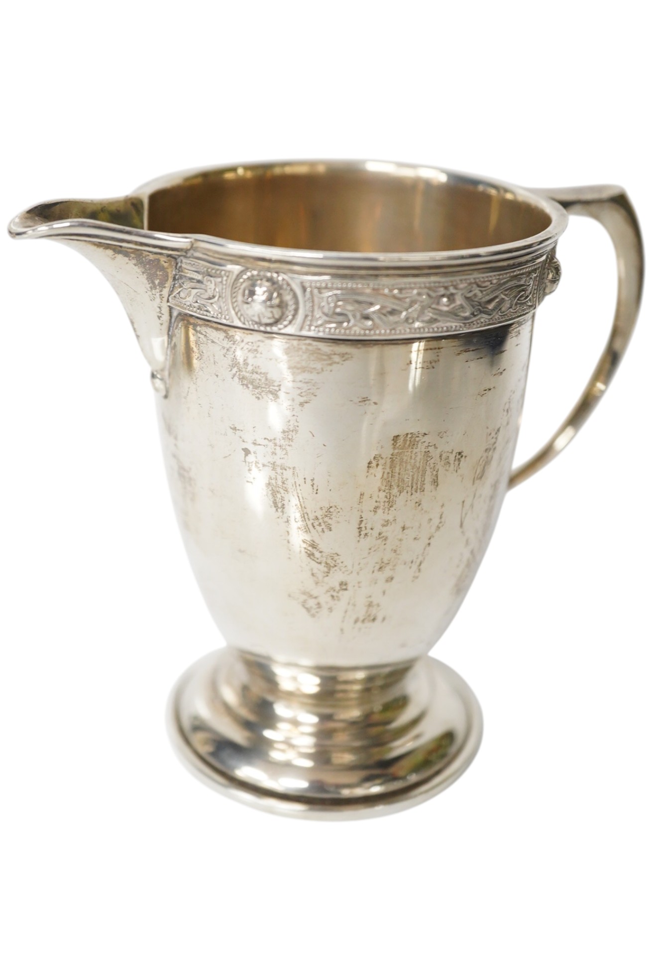 Lot 3851 , A George V silver cream jug and matching sugar caster with Celtic border, Boodle & Dunthorne, London, 1932, caster 14.3cm, 12oz.