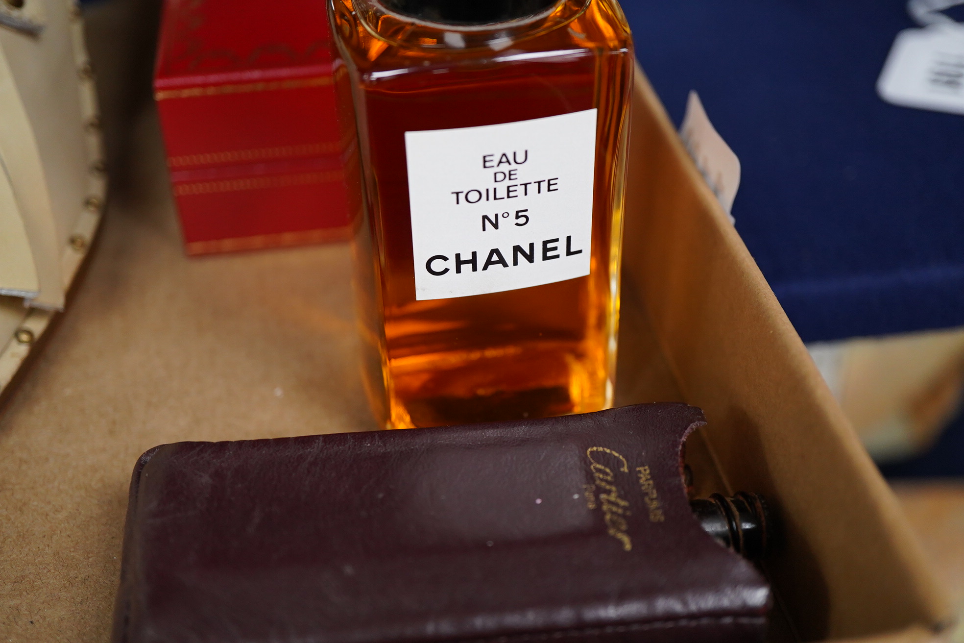 Lot 3192 , Christian Dior. A pair of vintage shoes & bottle of Diorama Paris perfume, together with a bottle of Must De Cartier Paris Parfum in original box, Chanel Eau De Toilette No.5, plus Cartier vintage leather pouch with empt