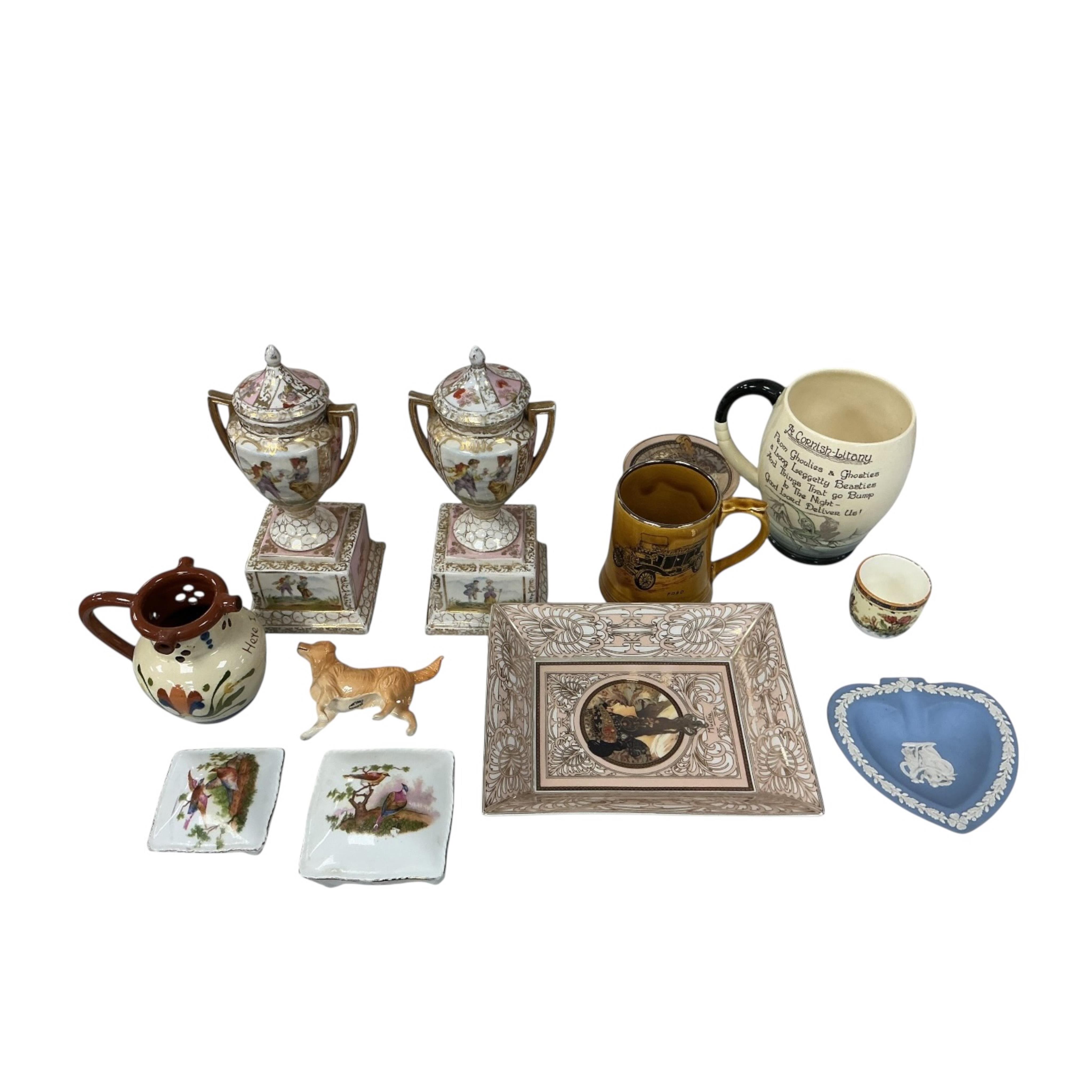 A collection of mixed ceramics to include a Beswick dog, Carltonware “Ghoul” mug, puzzle jug, Wedgwood dish and a Poole three section dish.
