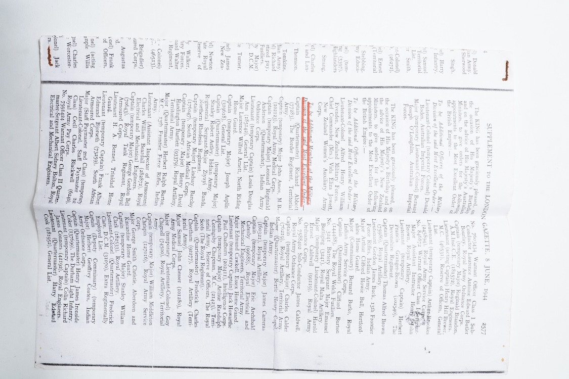 Lot 1341 , Two WWII medal groups, awarded to; S/54414 W.O.CL.1. C.E. Hayball. M.B.E. R.A.S.C., and M20620 J. Goliath, comprising